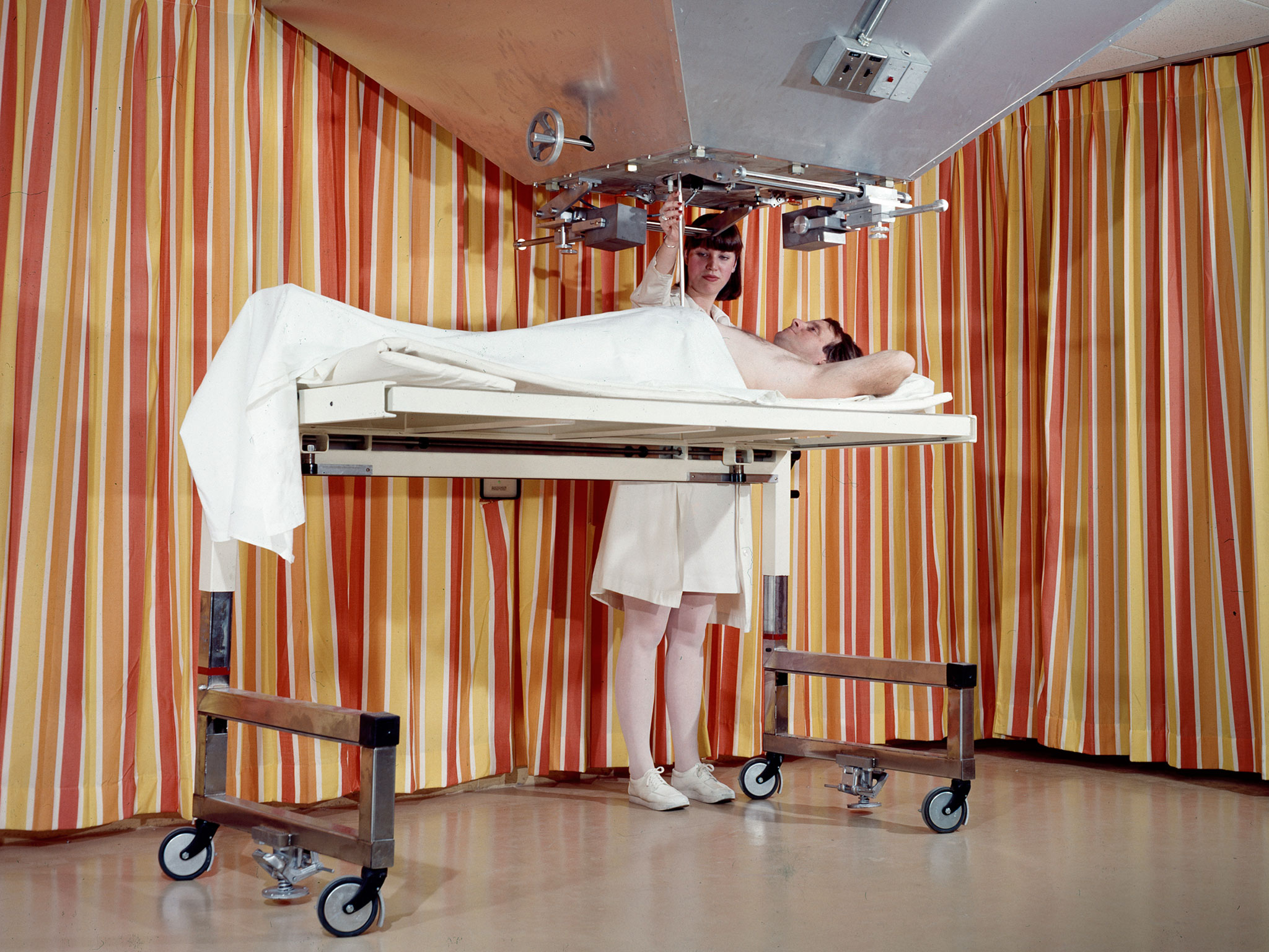 A cancer patient undergoes treatment in the Neutron Therapy Treatment Facility, or Cylotron, at the National Aeronautics and Space Administration (NASA) Lewis Research Center. After World War II Lewis researchers became interested in nuclear energy for propulsion. The focused their efforts on thermodynamics and strength of materials after radiation. In 1950 an 80-person Nuclear Reactor Division was created, and a cyclotron was built behind the Materials and Structures Laboratory. An in-house nuclear school was established to train these researchers in their new field. NASA cancelled its entire nuclear program in January 1973, just as the cyclotron was about to resume operations after a major upgrade. In 1975 the Cleveland Clinic Foundation partnered with NASA Lewis to use the cyclotron for a new type of radiation treatment for cancer patients. The cyclotron split beryllium atoms which caused neutrons to be released. The neutrons were streamed directly at the patient’s tumor. The facility had a dual-beam system that could target the tumor both vertically and horizontally. Over the course of five years, the cyclotron was used to treat 1200 patients. It was found to be particularly effective on salivary gland, prostrate, and other tumors. It was not as successful with tumors of the central nervous system. The program was terminated in 1980 as the Clinic began concentrating on non-radiation treatments.