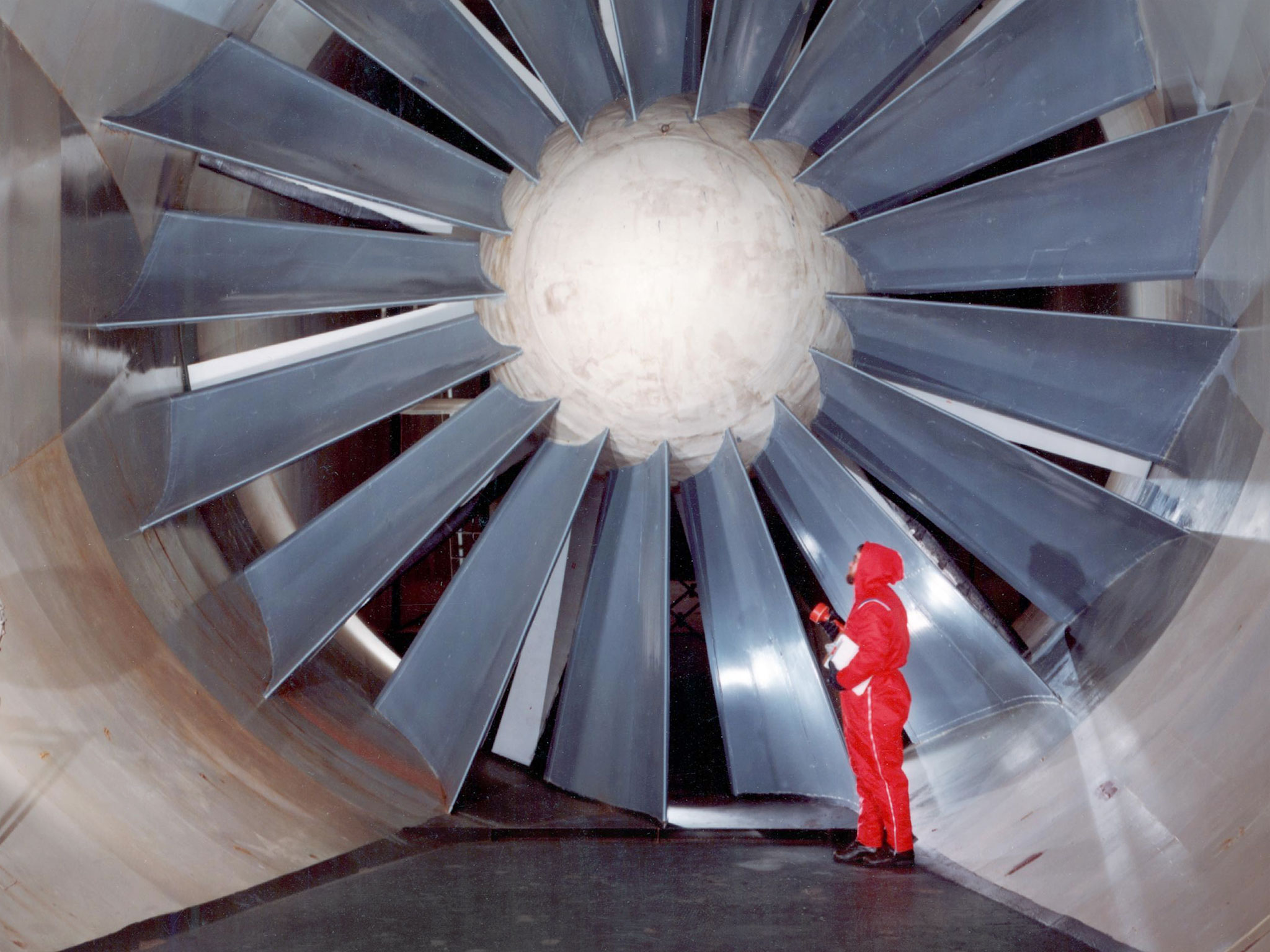 The drive fan for the Icing Research Tunnel at the National Aeronautics and Space Administration (NASA) Lewis Research Center in Cleveland, Ohio. The Lewis Icing Research Program, which began during World War II, utilized both research aircraft and the icing tunnel throughout the 1940s and 1950s. The research program was cancelled in 1958 as Lewis focused on space. The tunnel continued to be used occasionally for industrial customers in the 1960s and early 1970s. Lewis’ icing research was formally reinstituted just months before this photograph in 1978. The Icing Research Tunnel’s original 4100-horsepower induction motor was coupled directly to the 24-foot-diameter fan. Neoprene boots protected the leading edges of the 12 spruce fan blades. The system generated air speeds up to 300 miles per hour through the tunnel’s 6- by 9-foot test section. A large tail faring extended from the center of the fan to uniformly guide the airflow down the tunnel. NASA Headquarters ordered modifications to the Icing Research Tunnel in 1985 after wooden fan blades in a wind tunnel at Langley Research Center failed. Despite the fact that the large hub, seen in the center of the fan, provided an extra layer of protection against blade failure, Headquarters ordered the installation of a new set of wooden blades. The blades were ordered but not installed. The tunnel technicians instead agreed to inspect the fan after each run. A new 5000-horsepower motor was installed in 1987, and the original fan blades were finally replaced in 1993.