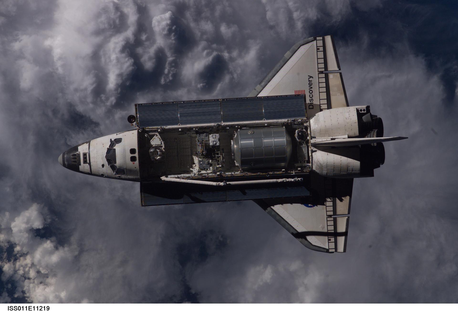 ISS011-E-11219 (28 July 2005) --- Overall view of the Space Shuttle Discovery as photographed during the survey operations performed by the Expedition 11 crew on the International Space Station during the STS-114 R-Bar Pitch Maneuver on Flight Day 3. Discovery docked to the station at 6:18 a.m. (CDT) on Thursday, July 28, 2005 as the two spacecraft orbited over the southern Pacific Ocean west of the South American coast. Onboard the shuttle were astronauts Eileen M. Collins, STS-114 commander; James M. Kelly, pilot; Andrew S. W. Thomas, Stephen K. Robinson, Wendy B. Lawrence, Charles J. Camarda and Japan Aerospace Exploration Agency (JAXA) astronaut Soichi Noguchi, all mission specialists. The Italian-built Raffaello Multi-Purpose Logistics Module (MPLM) is visible in the cargo bay.