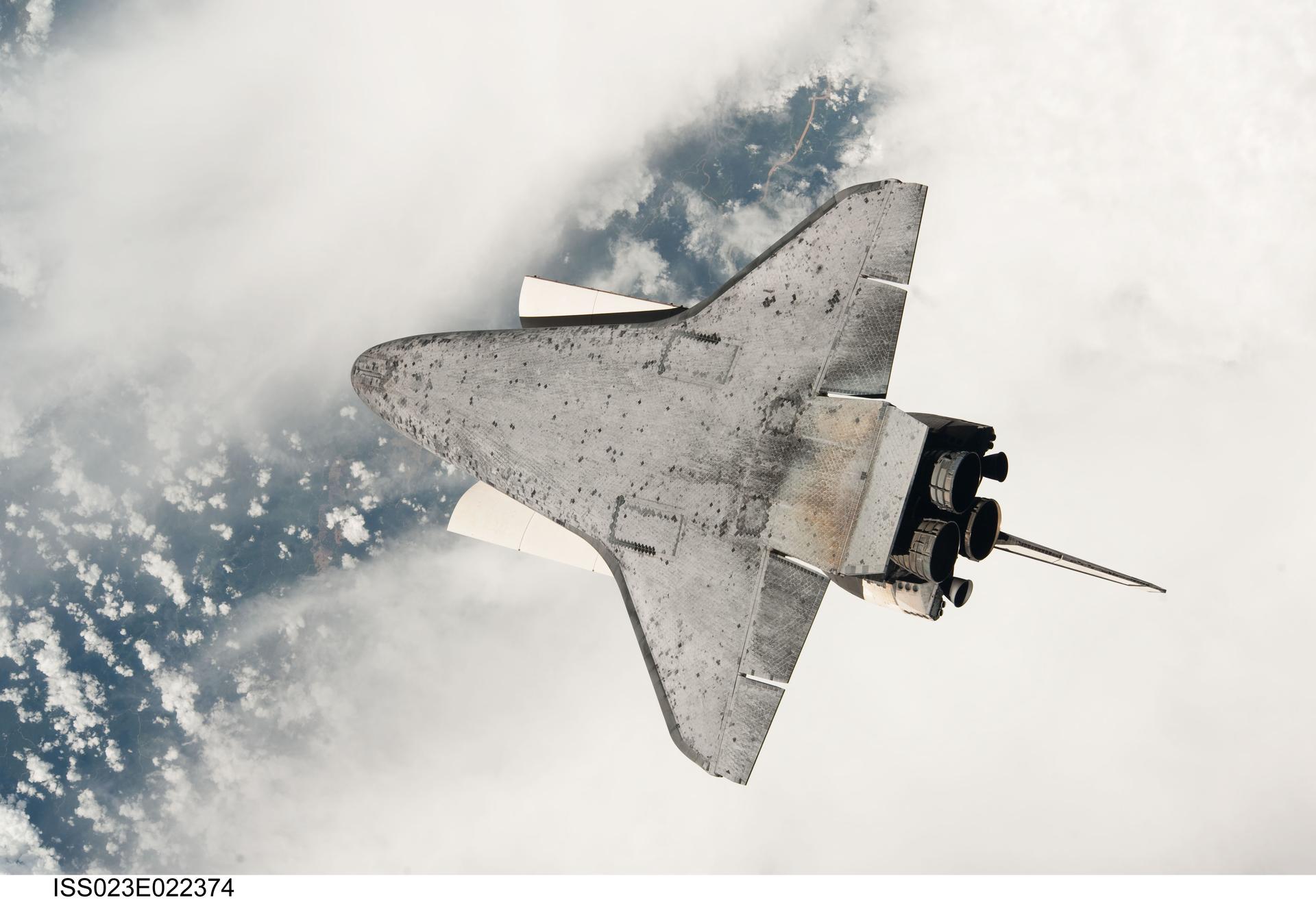 ISS023-E-022374 (7 April 2010) --- The underside of space shuttle Discovery is featured in this image photographed by an Expedition 23 crew member as the shuttle approaches the International Space Station during STS-131 rendezvous and docking operations. Docking occurred at 2:44 a.m. (CDT) on April 7, 2010.
