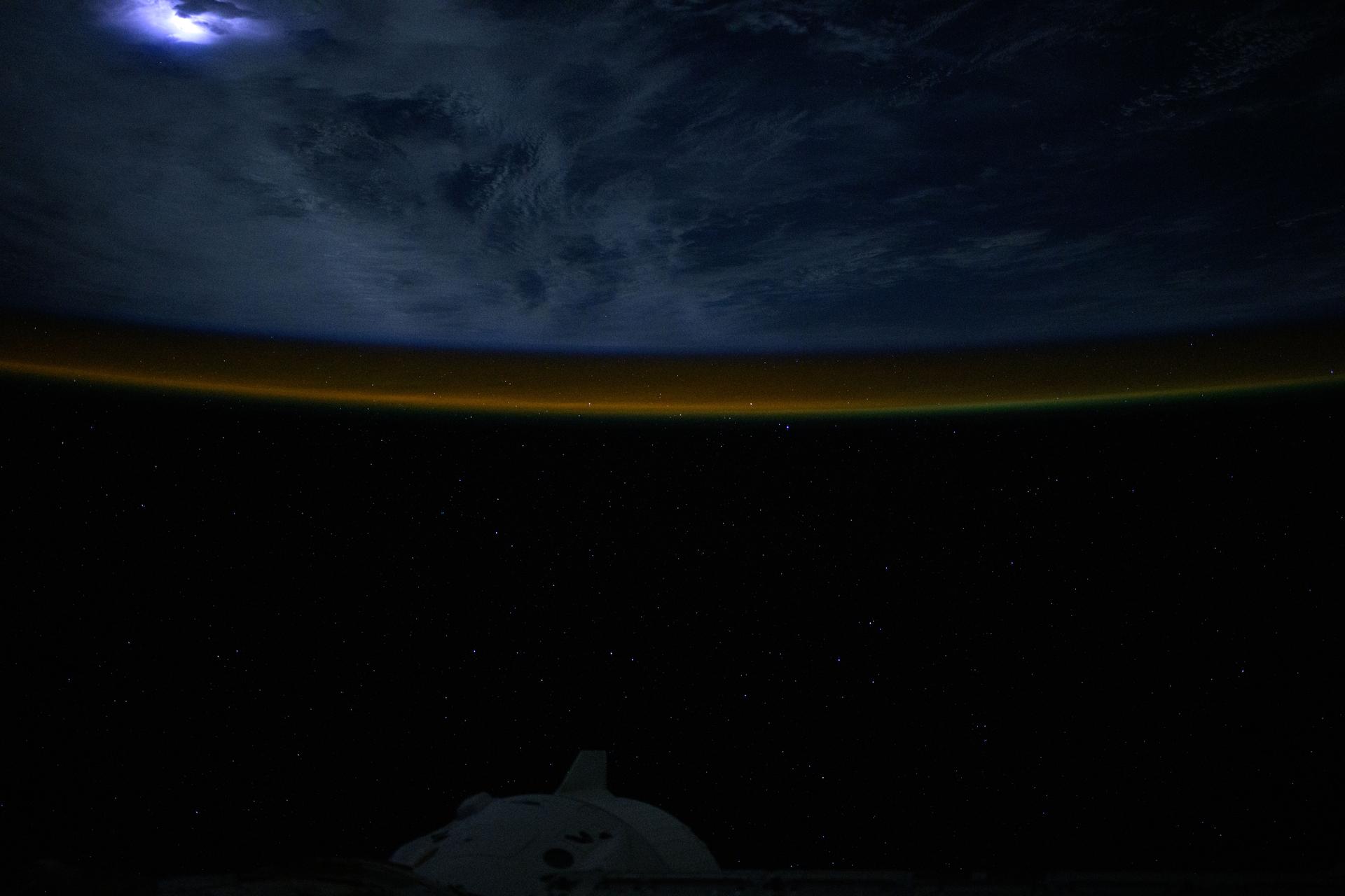iss073e0203588 (May 19, 2025) --- Lightning (upper left) illuminates the clouds and an atmospheric glow blankets Earth's horizon in this photograph from the International Space Station as it orbited 264 miles above the Atlantic Ocean off the coast of southern Brazil. At bottom, is the SpaceX Dragon crew spacecraft docked to the orbital outpost's forward port on the Harmony module.