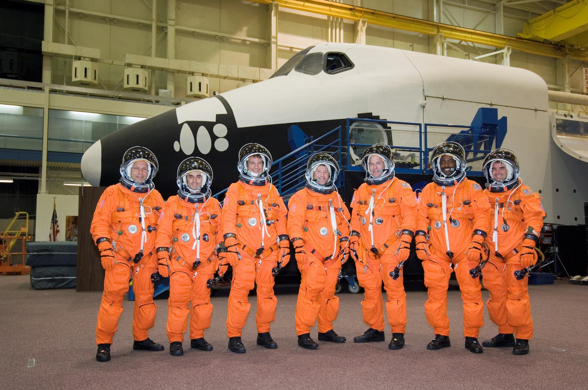 JSC2007-E-21252 (1 May 2007) --- The STS-122 crewmembers, attired in training versions of their shuttle launch and entry suits, pose for a crew photo prior to a training session in the Space Vehicle Mockup Facility at Johnson Space Center. From the left are European Space Agency (ESA) astronauts Hans Schlegel and Leopold Eyharts; astronauts Stanley G. Love, all mission specialists; Stephen N. Frick, commander; Alan G. Poindexter, pilot; Leland D. Melvin and Rex J. Walheim, both mission specialists. Eyharts is scheduled to join Expedition 16 as flight engineer after launching to the International Space Station on mission STS-122.