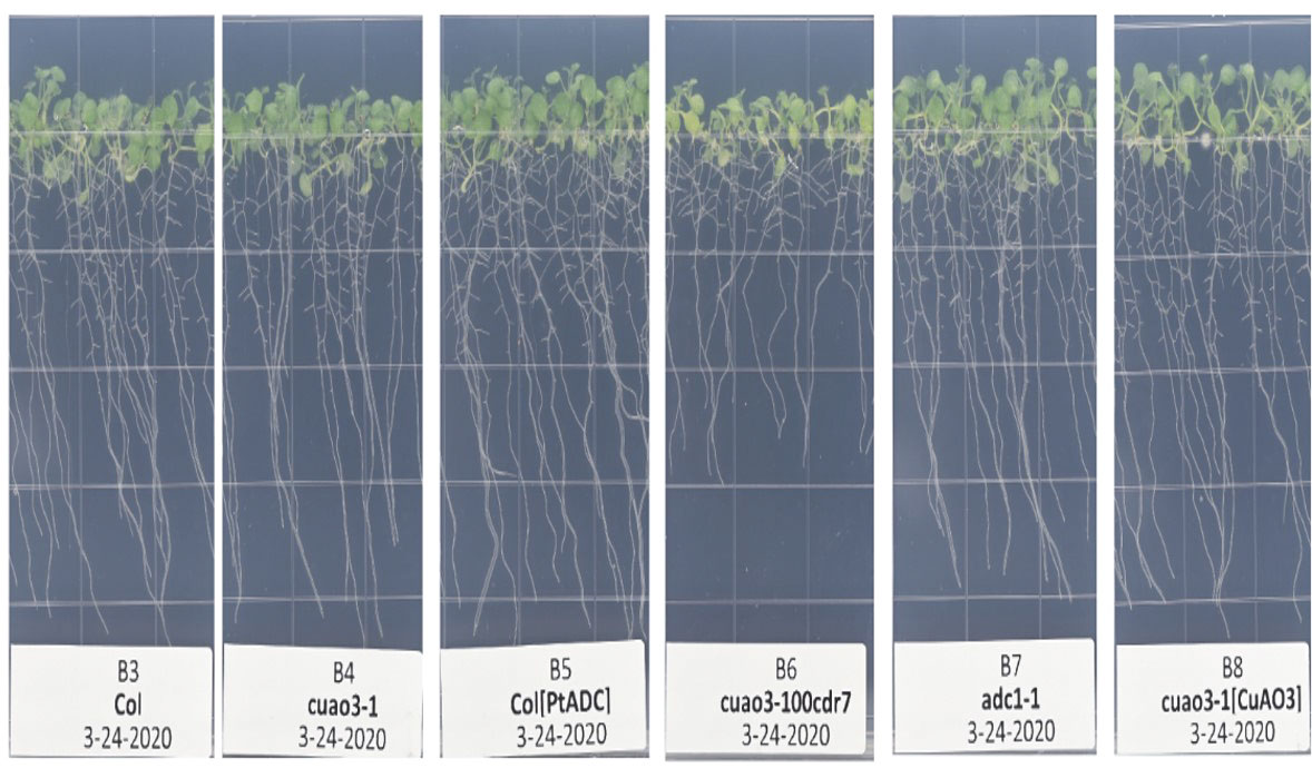 jsc2021e036657 (8/11/2021) --- Arabidopsis thaliana seedlings following 9 days of growth on 1.2% agar-based media in petri dishes in the VEGGIE growth chamber under temperature, humidity and CO2 conditions mimicking those recorded at the International Space Station. The genotypes of these plants are indicated at the bottom of each panel. These images were taken during the Science Verification Test carried out at NASA Kennedy Space Center. All genotypes grew equally well under these conditions except for the cuao3-100cdr7 mutant, which grew more slowly.
