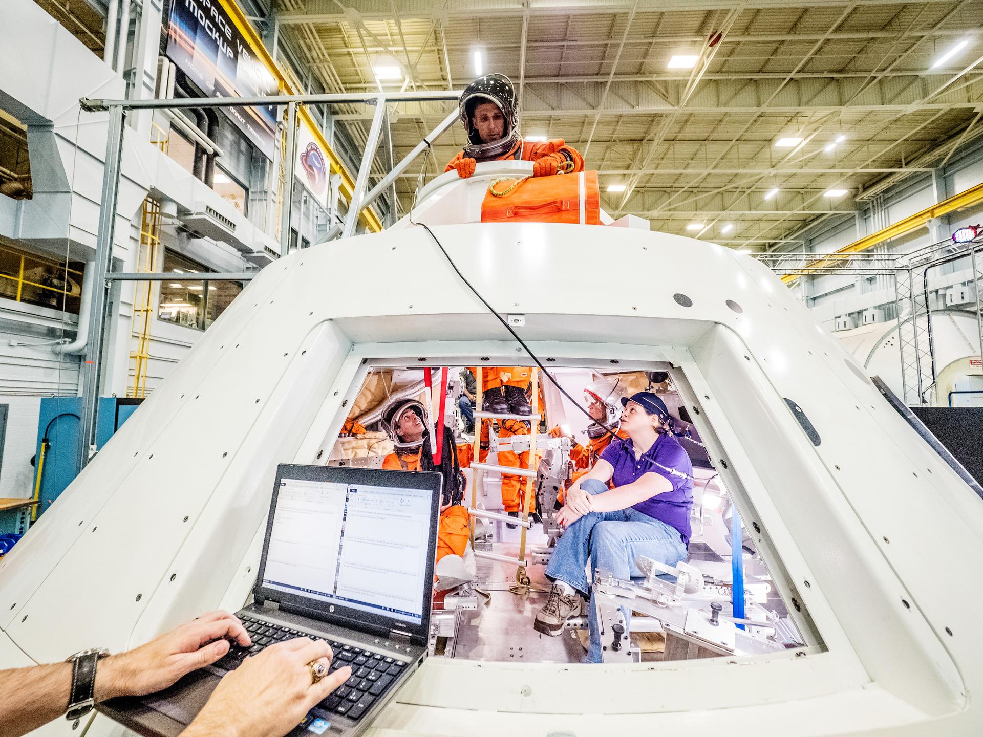 Engineers and astronauts conduct testing in a representative model of the Orion spacecraft at NASA’s Johnson Space Center in Houston on July 28, 2016 to gather the crew's feedback on the design of the docking hatch and on post-landing equipment operations. ..While the crew will primarily use the side hatch for entry and exit on Earth and the docking hatch to travel between Orion and a habitation module on long-duration deep space missions, the crew will need to be able to exit out of the docking hatch if wave heights in the Pacific Ocean upon splashdown are too high. The work is being done to help ensure all elements of Orion's design are safe and effective for the crew to use on future missions on the journey to Mars.