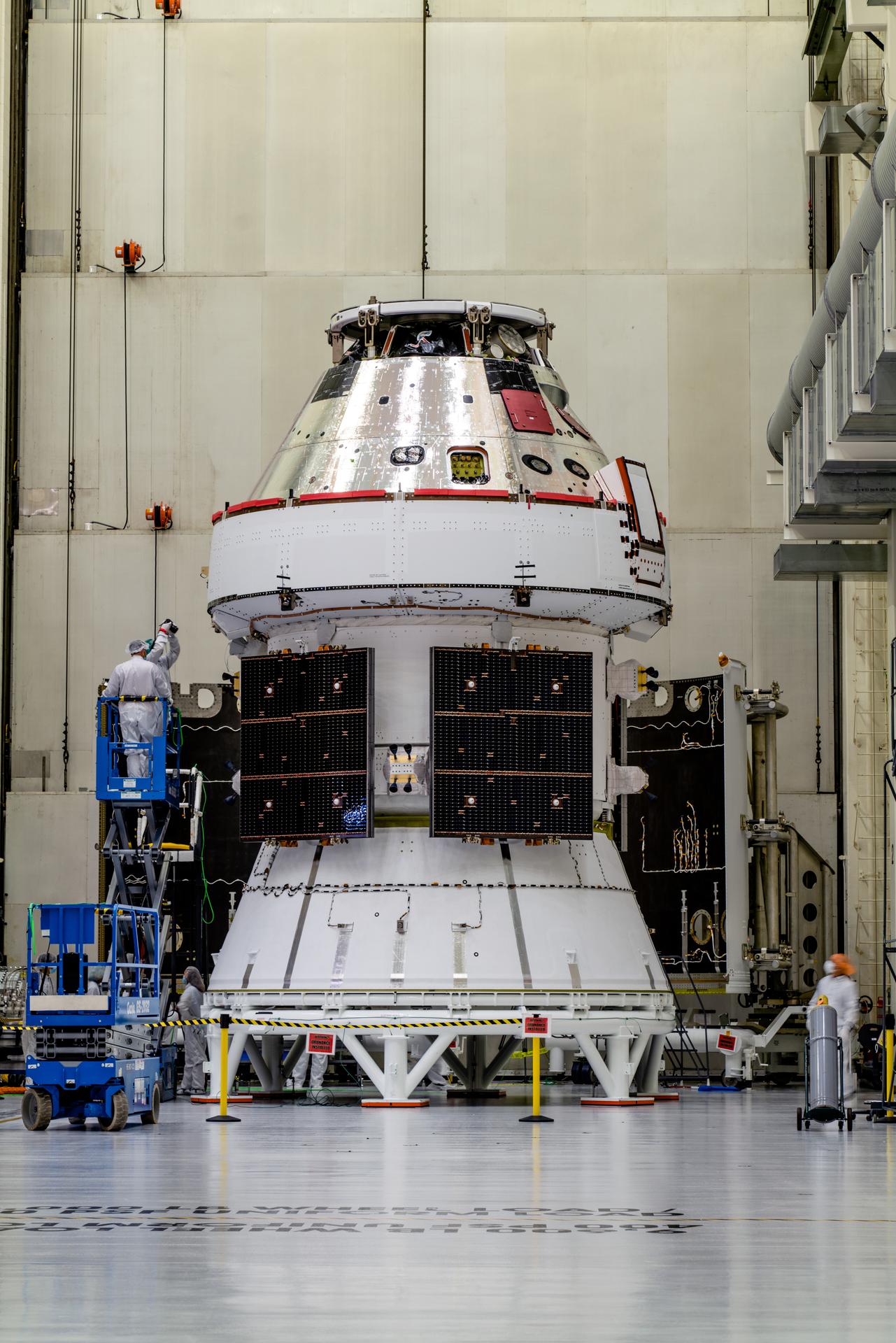 In the Operations and Checkout Building (O&C) at Kennedy Space Center, three spacecraft adapter jettison (SAJ) fairings are prepared for installation and will be moved into place by technicians with Lockheed Martin, lead contractor for Orion on Oct. 12, 2020. They will be secured around the spacecraft, encapsulating the European Service Module to protect it from the harsh environment as the spacecraft is propelled out of Earth’s atmosphere atop the Space Launch System (SLS) rocket during NASA’s Artemis I mission. The next time the solar array wings will be visible will be when Orion is in space. Artemis I will test the Orion spacecraft and SLS as an integrated system ahead of crewed flights to the Moon.