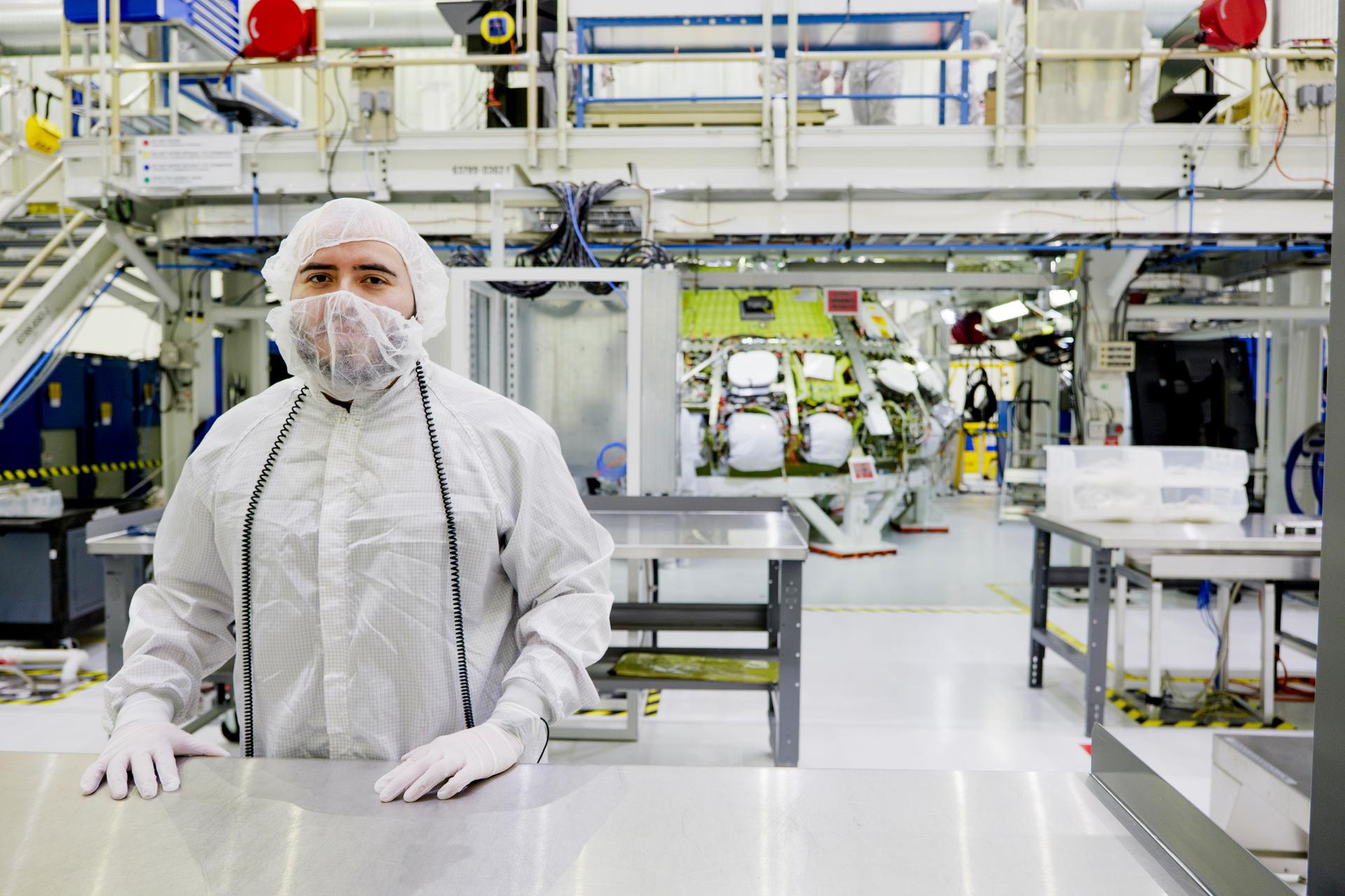Technicians work on the Artemis III Orion crew module inside the Operations and Checkout Building at NASA's Kennedy Space Center in Florida on March 5, 2025.