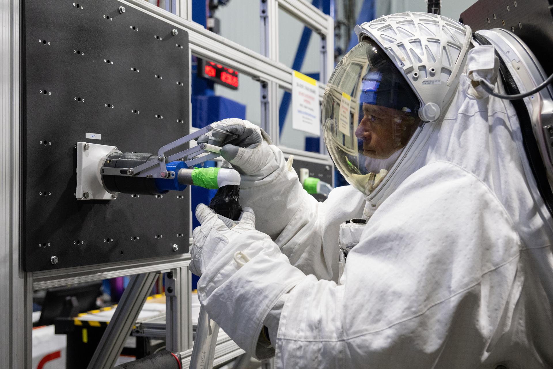 Artemis II astronaut Reid Wiseman completes a simulated fluid quick disconnect task as part of the Egress Fitness Task battery at NASA’s Johnson Space Center on Dec. 8, 2025. (NASA/Josh Valcarcel)