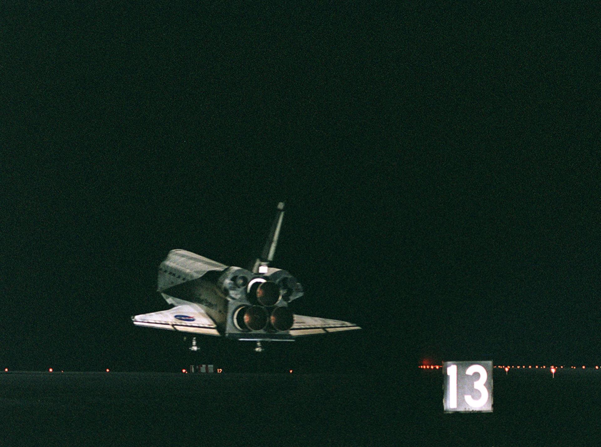 KENNEDY SPACE CENTER, Fla. -- The orbiter Atlantis nears touchdown on Runway 15 of the KSC Shuttle Landing Facility. Atlantis and crew traveled 4.9 million miles on the 11-day, 19-hour, 11-minute mission STS-106. Main gear touchdown occurred on-time at 3:56:48 a.m. EDT. During the mission to the International Space Station, the crew transferred nearly 5,000 pounds of equipment and supplies for use by the first resident crew expected to arrive in November. STS-106 was the 99th flight in the Shuttle program and the 22nd for Atlantis. STS-106 also marked the 15th nighttime landing in Shuttle history and the 23rd consecutive landing at KSC