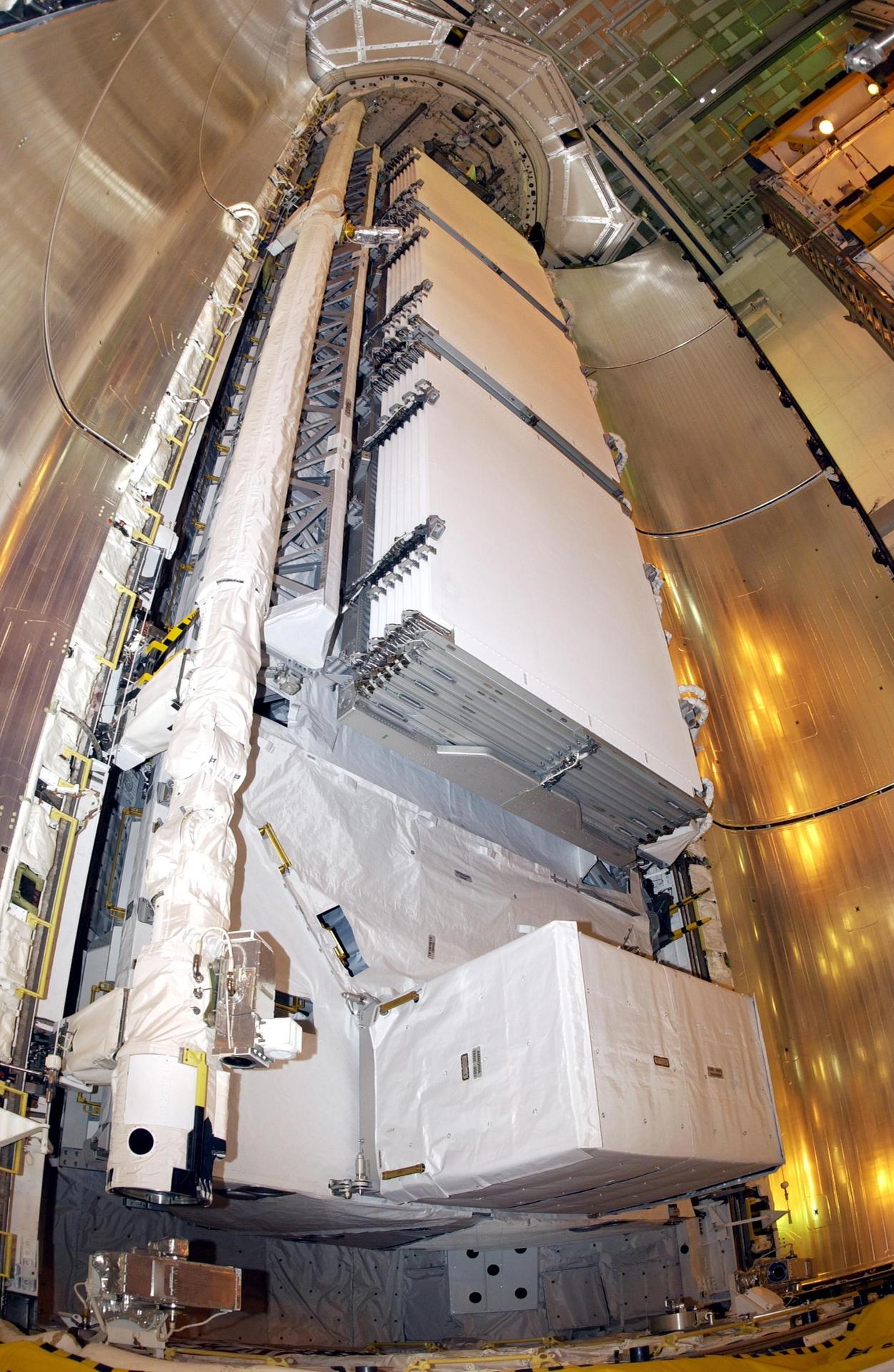 KENNEDY SPACE CENTER, FLA. -- -- The payload for mission STS-112 rests inside the payload bay of Space Shuttle Atlantis. The Shuttle is carrying the S1 Integrated Truss Structure, the first starboard truss segment, to be attached to the central truss segment, S0, plus the Crew and Equipment Translation Aid (CETA) Cart A. The CETA is the first of two human-powered carts that will ride along the ISS railway, providing mobile work platforms for future spacewalking astronauts. Launch of Atlantis is scheduled for Oct. 2 with a crew of six. The 11-day mission includes three spacewalks.
