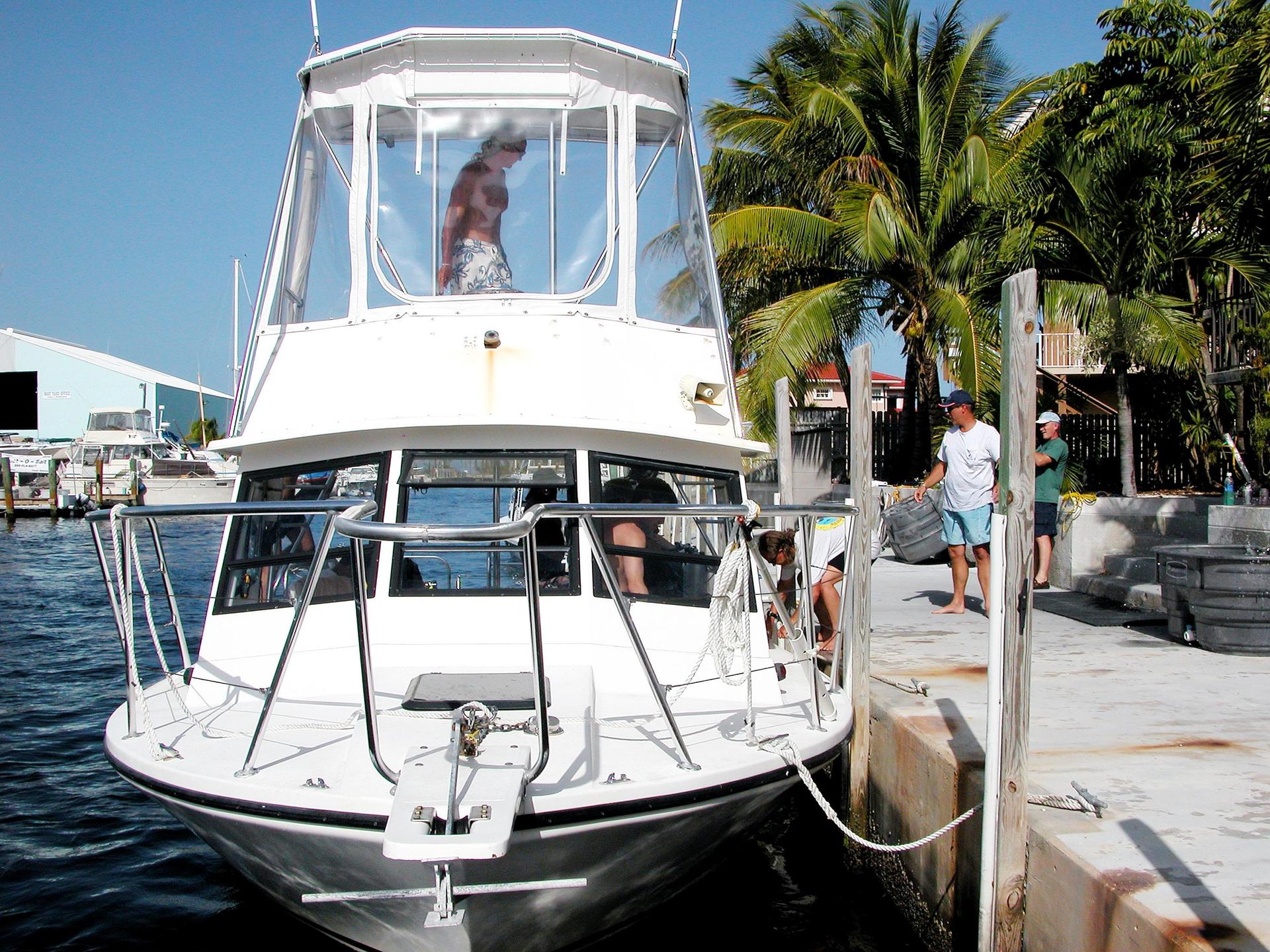 KENNEDY SPACE CENTER, FLA. - The boat with NEEMO-6 personnel ties up at the dock in Key Largo after a training session offshore at NASA’s undersea research station, named Aquarius. At right is Bill Todd, project lead. The NASA Extreme Environment Mission Operations 6 (NEEMO-6) mission involves spacewalk-like diving excursions and field-testing a variety of biomedical equipment designed to help astronauts living aboard the International Space Station. The NEEMO-6 team comprises astronaut John Herrington, mission commander, astronauts Doug Wheelock and Nick Patrick, and biomedical engineer Tara Ruttley. To prepare for their 10-day stay, the team had dive training twice a day at the Life Support Buoy, anchored above Aquarius.