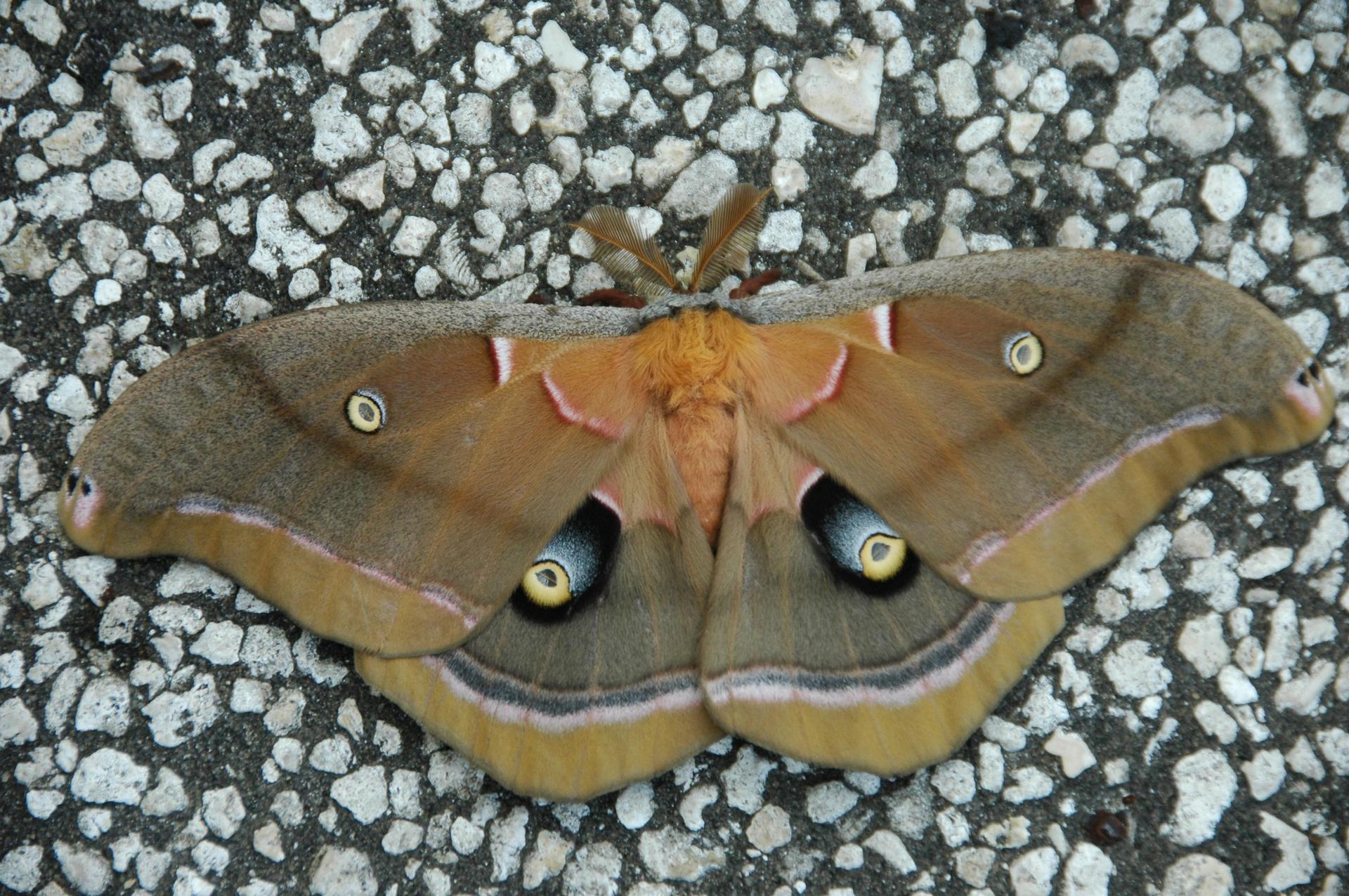 KENNEDY SPACE CENTER, FLA. -- A moth with unusual markings is captured on the ground at NASA's Kennedy Space Center. Insects are abundant throughout the center as it shares a boundary with the Merritt Island National Wildlife Refuge. Approximately one half of the Refuge's 140,000 acres consists of brackish estuaries and marshes. The remaining lands consist of coastal dunes, scrub oaks, pine forests and flatwoods, and palm and oak hammocks. Photo credit: NASA/Amanda Diller