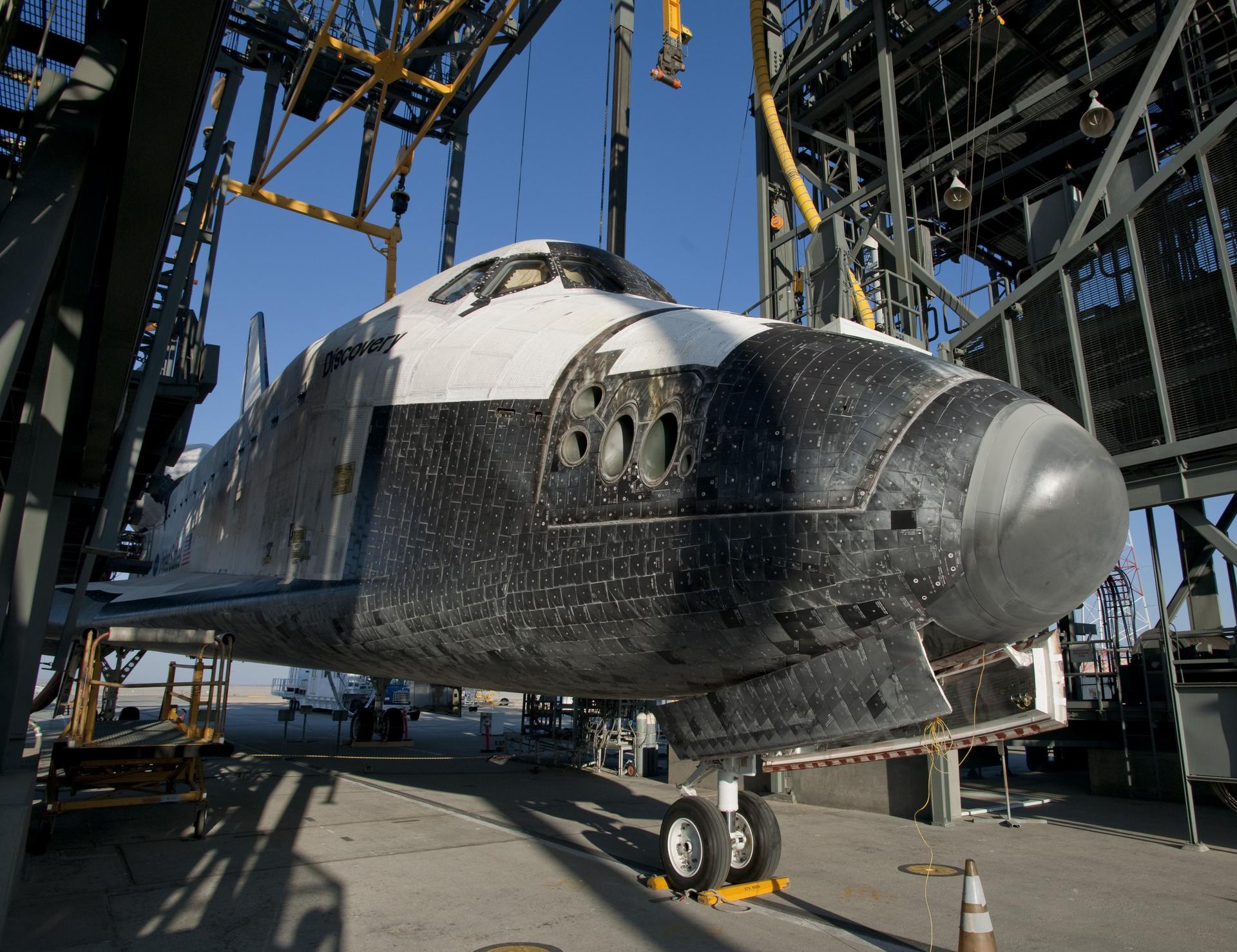 EDWARDS AIR FORCE BASE, Calif. -- (ED09-0253-15) The Space Shuttle Discovery is parked within the Mate-Demate Device gantry at NASA’s Dryden Flight Research Center prior to begin turnaround processing for its ferry flight back to NASA's Kennedy Space Center in Florida. Discoloration on Discovery’s reinforced carbon-carbon nose cap gives evidence of the extreme heating it encountered during re-entry into the Earth’s atmosphere prior to landing Sept. 11. NASA photo / Tony Landis
