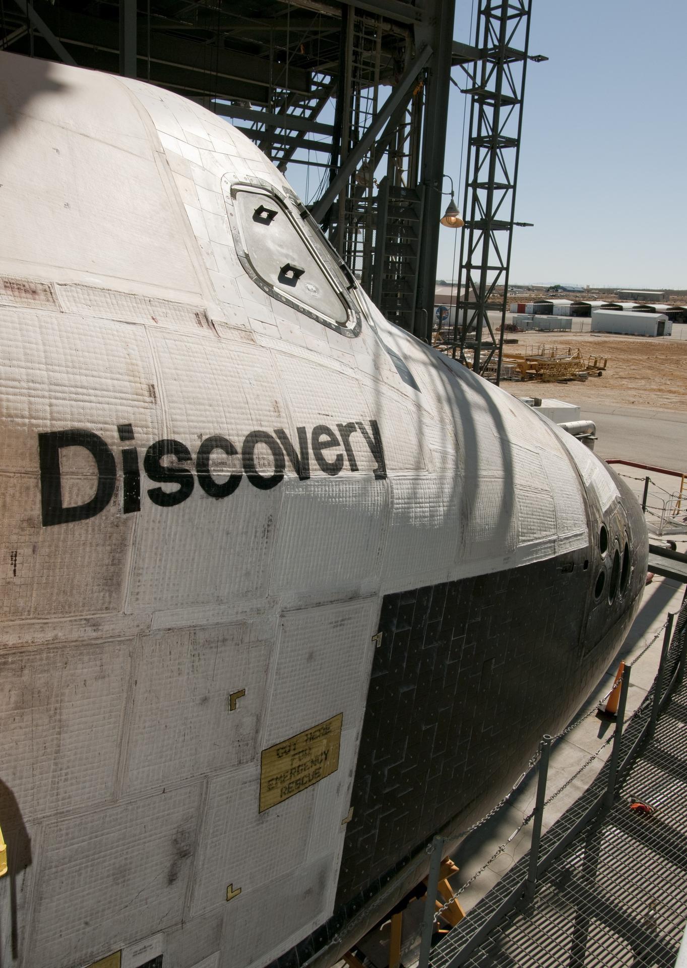 EDWARDS AIR FORCE BASE, Calif. – (ED09-0253-73) The nose of Space Shuttle Discovery peers out from work platforms while undergoing servicing in the Mate-DeMate Device at NASA’s Dryden Flight Research Center in preparation for its ferry flight to NASA’s Kennedy Space Center in Florida. Discovery returned to Earth Sept. 11 on the STS-128 mission, landing at Edwards Air Force Base in California. The shuttle delivered more than 7 tons of supplies, science racks and equipment, as well as additional environmental hardware to sustain six crew members on the International Space Station. Photo credit: NASA/Tony Landis