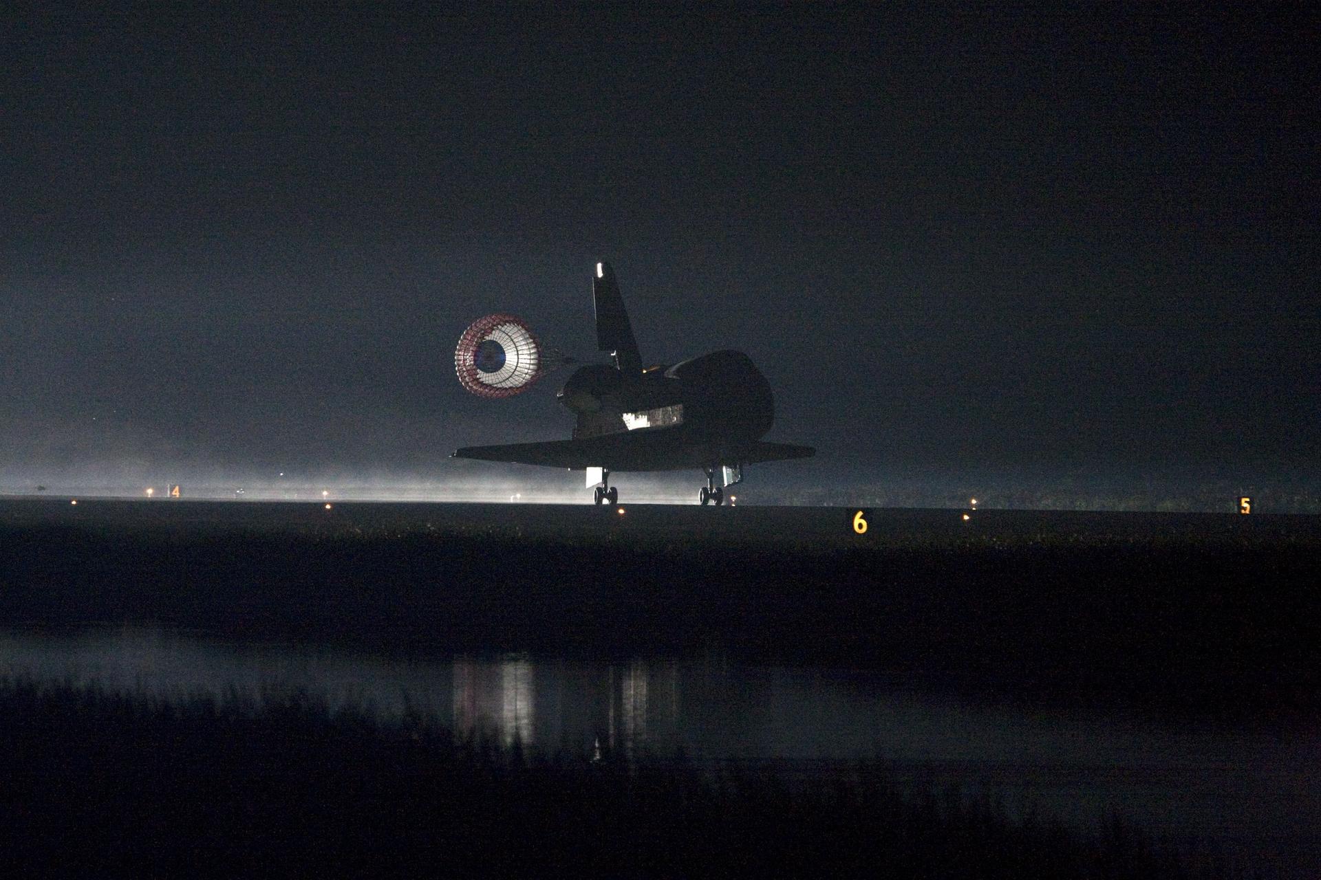 CAPE CANAVERAL, Fla. -- Xenon lights illuminate space shuttle Endeavour's unfurled drag chute as the vehicle rolls to a stop on the Shuttle Landing Facility's Runway 15 at NASA's Kennedy Space Center in Florida for the final time. Main gear touchdown was at 2:34:51 a.m. EDT, followed by nose gear touchdown at 2:35:04 a.m., and wheelstop at 2:35:36 a.m. On board are STS-134 Commander Mark Kelly, Pilot Greg H. Johnson, and Mission Specialists Mike Fincke, Drew Feustel, Greg Chamitoff and the European Space Agency's Roberto Vittori. STS-134 delivered the Alpha Magnetic Spectrometer-2 (AMS) and the Express Logistics Carrier-3 (ELC-3) to the International Space Station. AMS will help researchers understand the origin of the universe and search for evidence of dark matter, strange matter and antimatter from the station. ELC-3 carried spare parts that will sustain station operations once the shuttles are retired from service. STS-134 was the 25th and final flight for Endeavour, which has spent 299 days in space, orbited Earth 4,671 times and traveled 122,883,151 miles. Photo credit: NASA/George Roberto