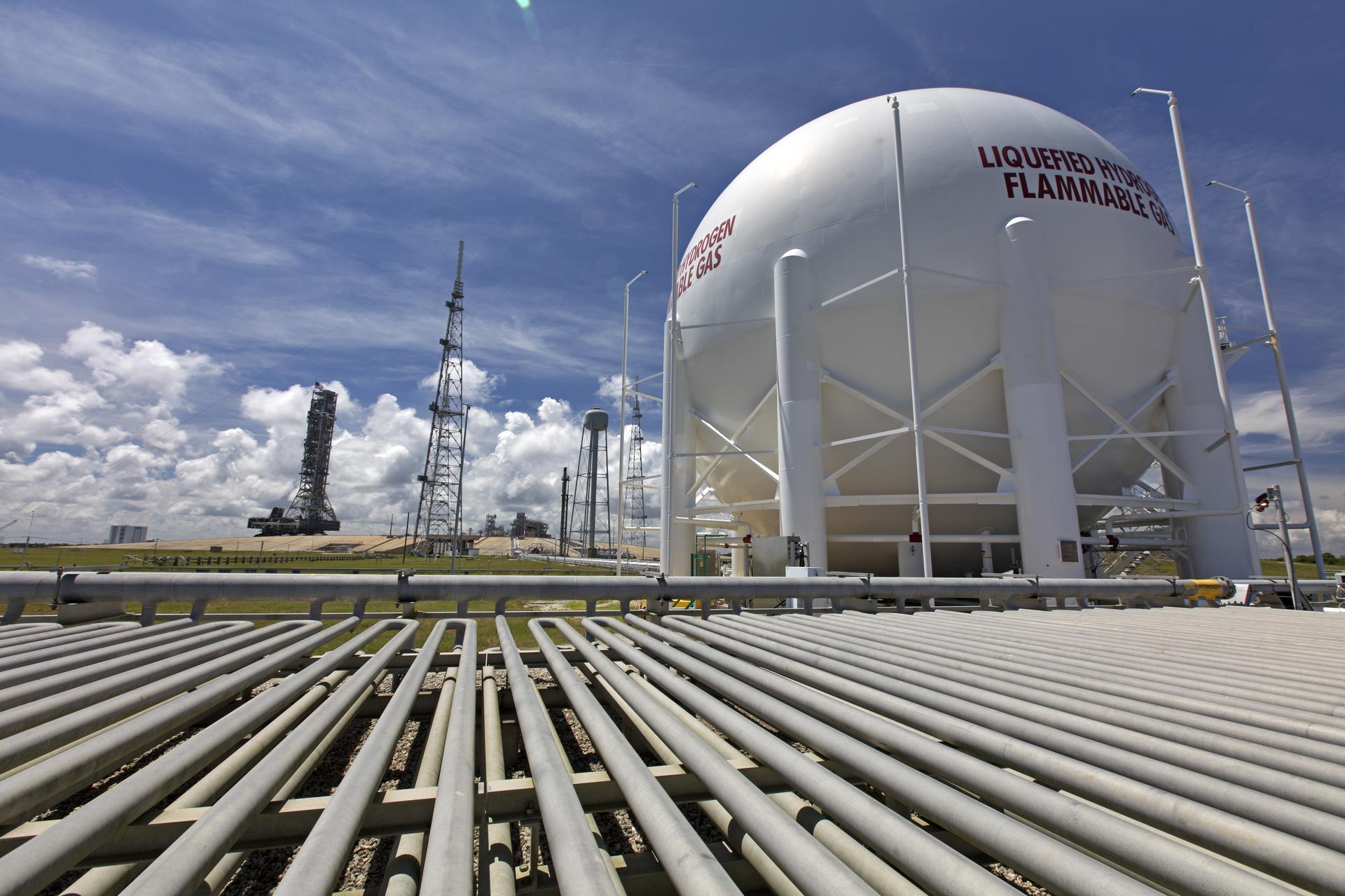 A liquid hydrogen storage tank is in view as NASA's mobile launcher (ML) atop crawler-transporter 2 makes its way up the ramp at Launch Pad 39B on Aug. 31, 2018, at the agency's Kennedy Space Center in Florida. The ML will undergo a fit check, followed by several days of systems testing. The 380-foot-tall mobile launcher is equipped with the crew access arm and several umbilicals that will provide power, environmental control, pneumatics, communication and electrical connections to NASA's Space Launch System (SLS) and Orion spacecraft. Exploration Ground Systems is preparing the ground systems necessary to launch SLS and Orion on Exploration Mission-1, missions to the Moon and on to Mars.