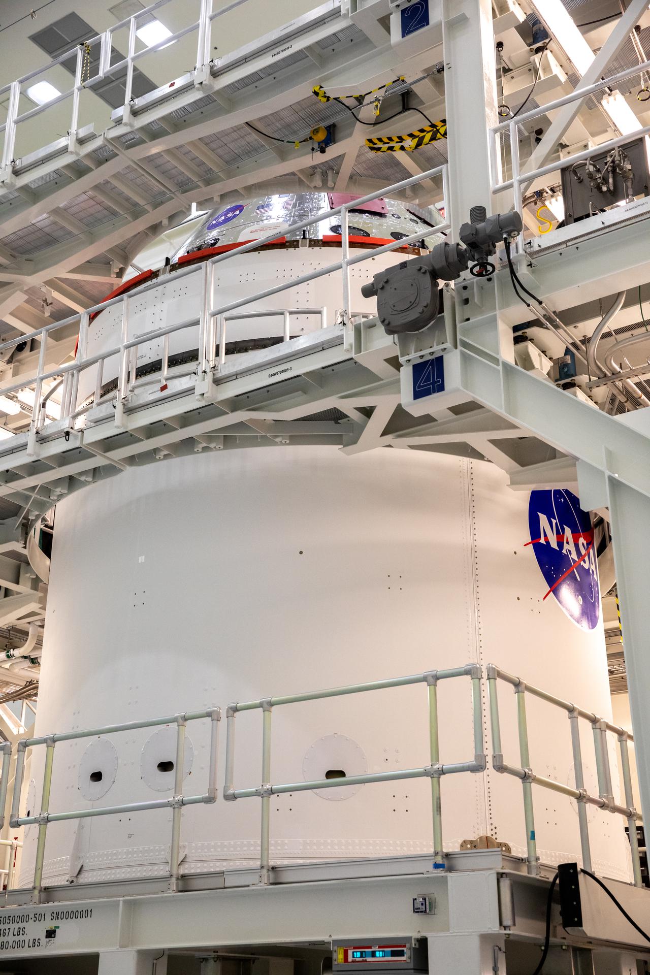 NASA’s famous “meatball” insignia is affixed to the Artemis I Orion spacecraft adapter jettison fairings, which protect the European built service module, Jan. 20, 2021, inside the Multi-Payload Processing Facility at NASA’s Kennedy Space Center in Florida. Shown inside its servicing stand, ground processing begins on Orion, with the Exploration Ground Systems and Jacobs teams performing checkouts and fueling the spacecraft with commodities as part of preparations ahead of the Artemis I mission.
