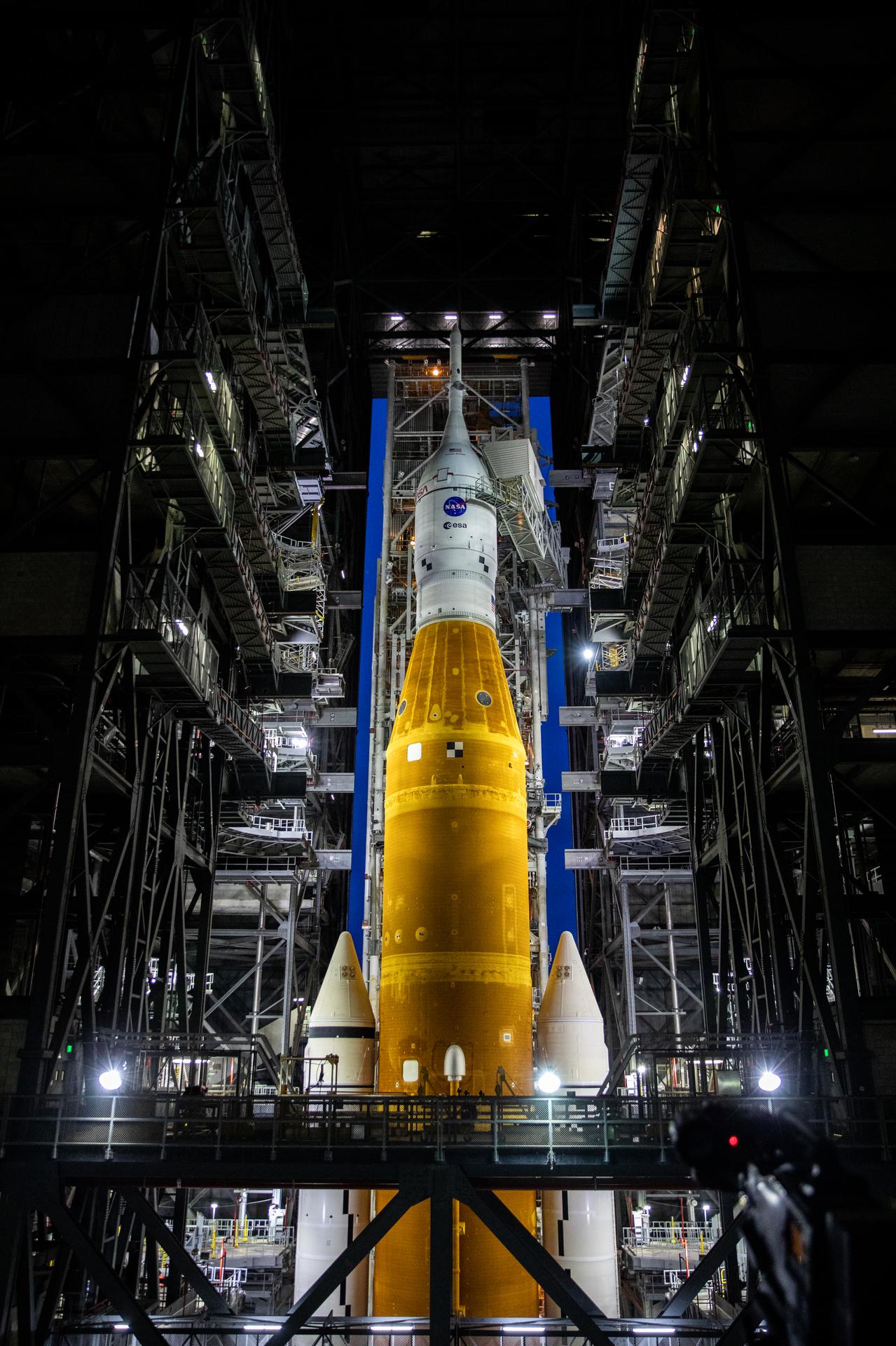 The mobile launcher with NASA’s Space Launch System (SLS) rocket and Orion spacecraft aboard is seen inside the Vehicle Assembly Building during the opening of the doors to High Bay 3 before rolling out to Launch Complex 39B for launch, Tuesday, Aug. 16, 2022, at NASA’s Kennedy Space Center in Florida. As part of the agency’s Artemis I flight test, the fully stacked and integrated SLS rocket and Orion spacecraft is scheduled to liftoff on Monday, Aug. 29. The first in a series of increasingly complex missions, Artemis I will provide a foundation for human deep space exploration and demonstrate our commitment and capability to extend human presence to the Moon and beyond. The primary goal of Artemis I is to thoroughly test the integrated systems before crewed missions by launching Orion atop the SLS rocket, operating the spacecraft in a deep space environment, testing Orion’s heat shield, and recovering the crew module after reentry, descent, and splashdown.