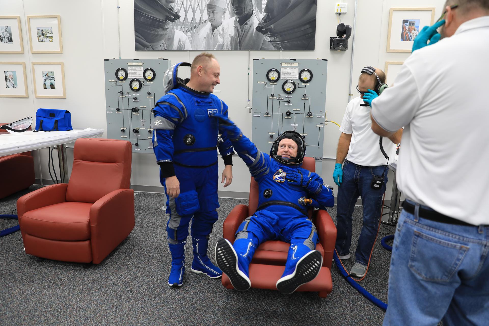 NASA astronaut Barry “Butch” Wilmore (right), Boeing Crew Flight Test (CFT) commander, and Mike Fincke, CFT backup spacecraft test pilot, check their spacesuits during a crew validation test inside the Astronaut Crew Quarters at NASA’s Kennedy Space Center in Florida on Oct. 18, 2022. Wilmore and Fincke, along with NASA astronaut Suni Williams, CFT pilot, with assistance from the Boeing team, successfully completed the validation test during which they suited up and tested out the pressurized crew module to ensure seat fit, suit functionality, cabin temperature, audio system, and day of launch operations. Boeing’s CFT is scheduled to launch in April 2023.