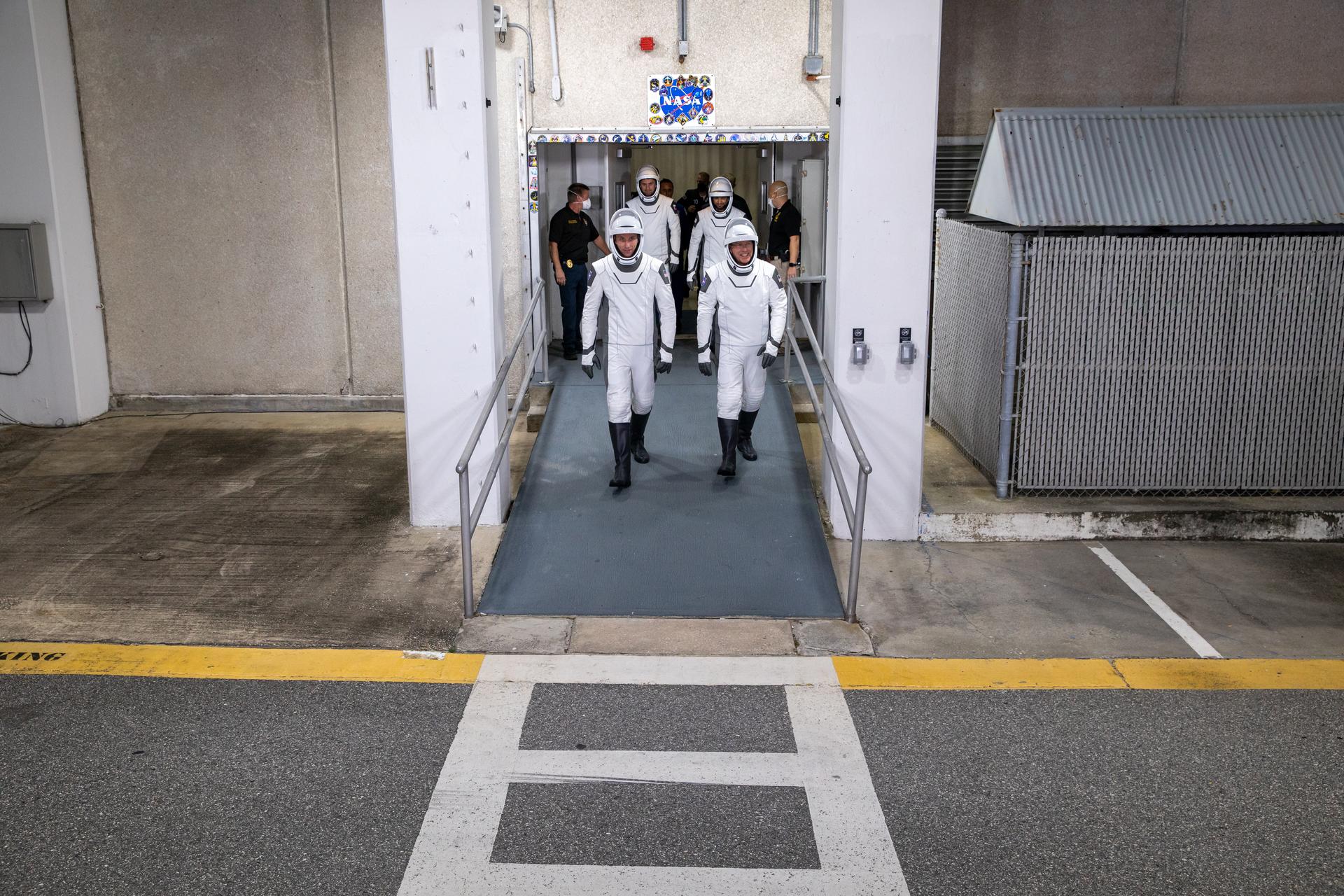 NASA’s SpaceX Crew-6 astronauts walk out of the Neil Armstrong Operations and Checkout Building at the agency’s Kennedy Space Center in Florida during a countdown dress rehearsal on Feb. 23, 2023, to prepare for the upcoming Crew-6 launch. In front, from left are NASA astronaut Warren “Woody” Hoburg, pilot; and NASA astronaut Stephen Bowen, spacecraft commander. Behind them, from left are Andrey Fedyaev, Roscosmos cosmonaut and mission specialist; and Sultan Alneyadi, UAE (United Arab Emirates) astronaut and mission specialist. The crew will launch to the International Space Station aboard the Crew Dragon Endeavour on a SpaceX Falcon 9. Launch is targeted for 1:45 a.m. EST on Feb. 27 from Launch Complex 39A. Crew-6 is the sixth crew rotation mission with SpaceX to the station, and the seventh flight of Dragon with people as part of the agency’s Commercial Crew Program.