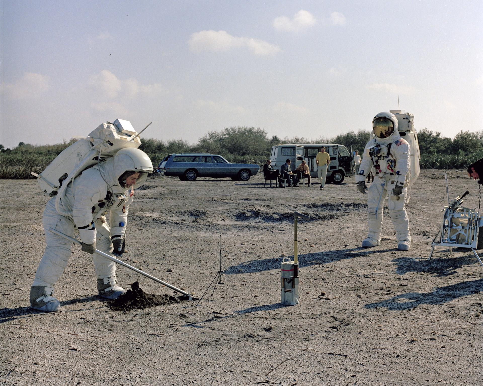 CAPE CANAVERAL, Fla. -- Backup Commander John Young, left, and Lunar Module Pilot Charlie Duke are going through a practice exercise for the Apollo 13 mission at a field site at the Kennedy Space Center. Photo credit: NASA