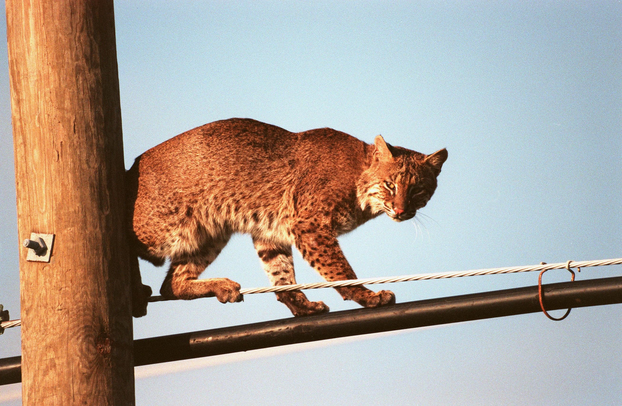 KENNEDY SPACE CENTER, FLA. -- A young, male bobcat balances gingerly on telephone pole cables next to the south-bound lane of Kennedy Parkway. The cat is nocturnal and is seldom observed during the day unless scared from its daytime shelter in the grass or beneath a shrub. Usually found in broken sections of heavily wooded or brushy country, bobcats are reported as common in scrub strand and roadside or weedy grass habitats at KSC. The bobcat is known to inhabit mangrove habitats and will readily swim across small bodies of water. The bobcat occurs across southern Canada then south over the entire United States, except for the midwestern corn belt, to southern Mexico. It is the last large mammalian predator remaining on KSC. The Merritt Island National Wildlife Refuge, which is located on Kennedy Space Center property, is home to many species of wild animals, including the bobcat.