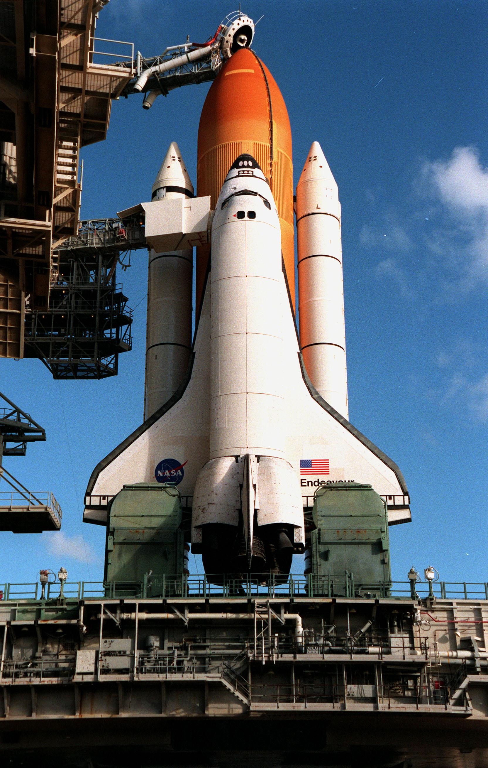 KENNEDY SPACE CENTER, FLA. -- With the Rotating Service Structure on Launch Pad 39A rolled back, the Space Shuttle Endeavour on top of the Mobile Launcher Platform is poised for launch on mission STS-88. Lift-off is targeted for 3:56 a.m. on Dec. 3. The first U.S. launch for the International Space Station, STS-88 is expected to last 11 days, 19 hours and 49 minutes, and land at 10:17 p.m. EST on Dec. 14. Endeavour carries the Unity connecting module which the crew will be mating with the Russian-built Zarya control module already in orbit. In addition to Unity, two small replacement electronics boxes are on board for possible repairs to Zarya batteries