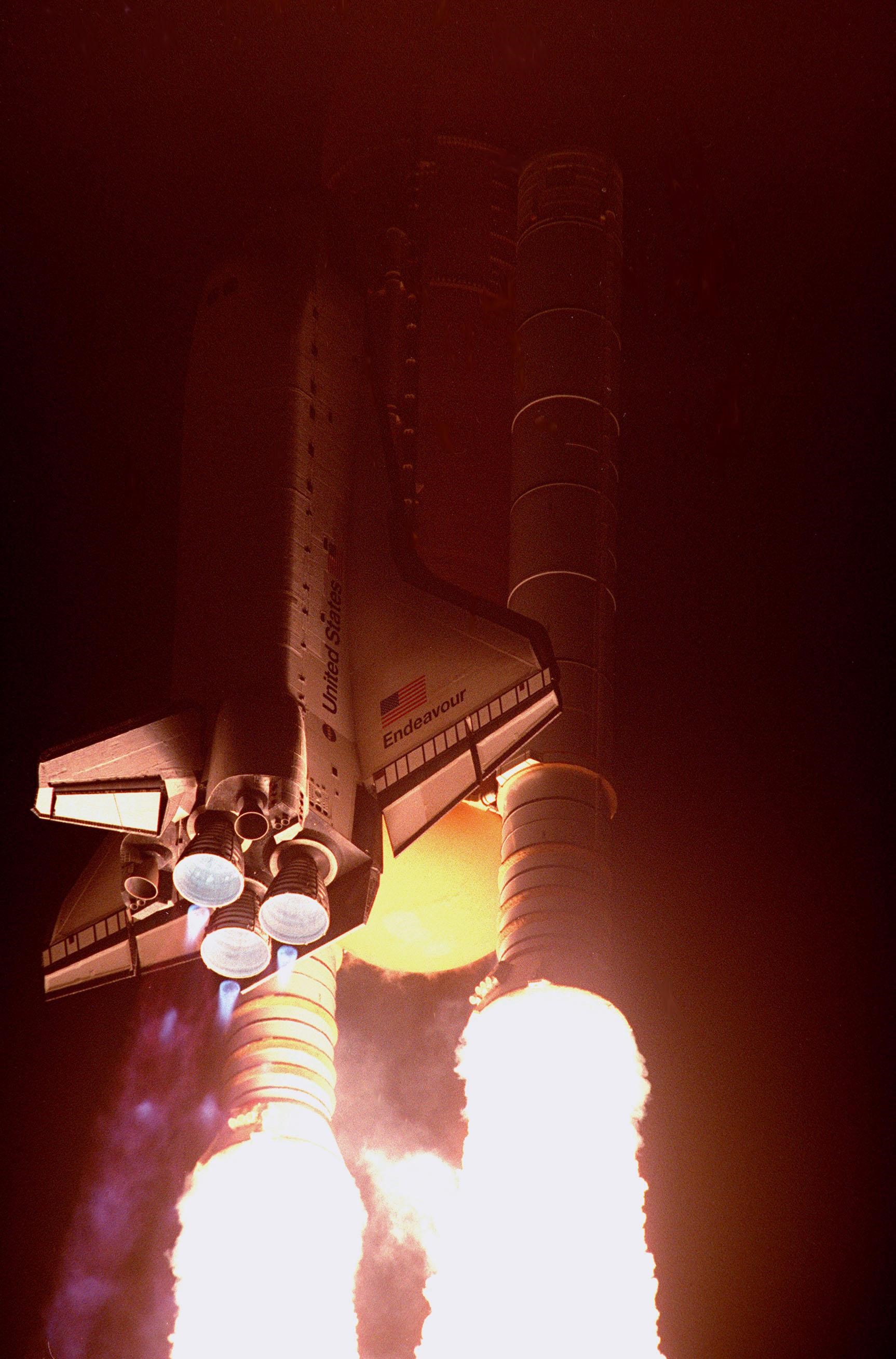 KENNEDY SPACE CENTER, Fla. -- The Space Shuttle Endeavour blazes through the night sky as it begins the first U.S. mission, STS-88, dedicated to the assembly of the International Space Station. Liftoff on Dec. 4 from Launch Pad 39A was at 3:35:34 a.m. EST. During the nearly 12-day mission, the six-member crew will mate in space the first two elements of the International Space Station the already-orbiting Zarya control module with the Unity connecting module carried by Endeavour. Crew members are Commander Robert D. Cabana, Pilot Frederick W. "Rick" Sturckow, and Mission Specialists Nancy J. Currie, Jerry L. Ross, James H. Newman and Sergei Konstantinovich Krikalev, a Russian cosmonaut. This was the second launch attempt for STS-88. The first one on Dec. 3 was scrubbed when launch controllers, following an assessment of a suspect hydraulic system, were unable to resume the countdown clock in time to launch within the remaining launch window