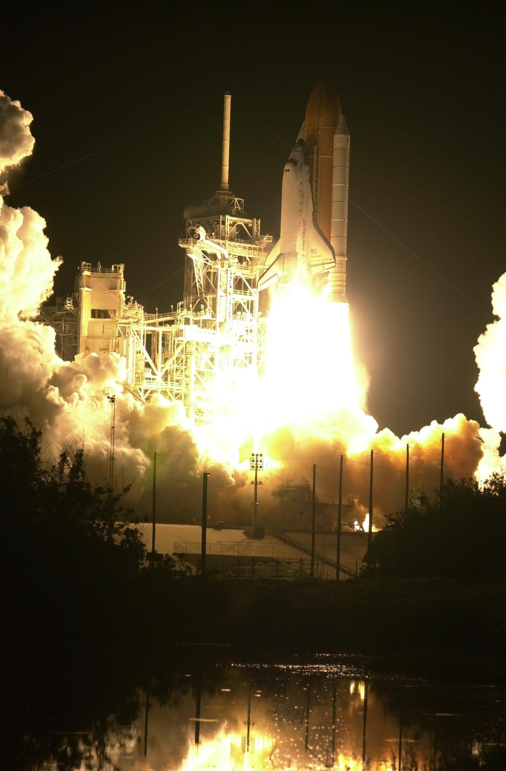 (Nikon camera D1 test)The blazing light of Space Shuttle Discovery's launch turns night into day at Launch Pad 39B. The successful liftoff occurred on time at 7:50:00.069 EST from Launch Pad 39B on mission STS-103. On board are Commander Curtis L. Brown Jr., Pilot Scott J. Kelly and Mission Specialists Steven L. Smith, C. Michael Foale (Ph.D.), John M. Grunsfeld (Ph.D.), Claude Nicollier of Switzerland and Jean-François Clervoy of France. Nicollier and Clervoy are with the European Space Agency. STS-103 is a Hubble Servicing Mission, with three planned space walks designed to install new equipment and replace old. The primary objective is to replace the gyroscopes that make up the three Rate Sensor Units. Extravehicular activities include installing a new computer, changing out one of the Fine Guidance Sensors, replacing a tape recorder with a new solid state recorder, and installing a voltage/temperature improvement kit, and begin repairing the insulation on the telescope's outer surface. After the 7-day, 21-hour mission, Discovery is expected to land at KSC Monday, Dec. 27, at about 5:24 p.m. EST. This is the 27th flight of Discovery and the 96th mission in the Space Shuttle Program. It is the third launch at Kennedy Space Center in 1999