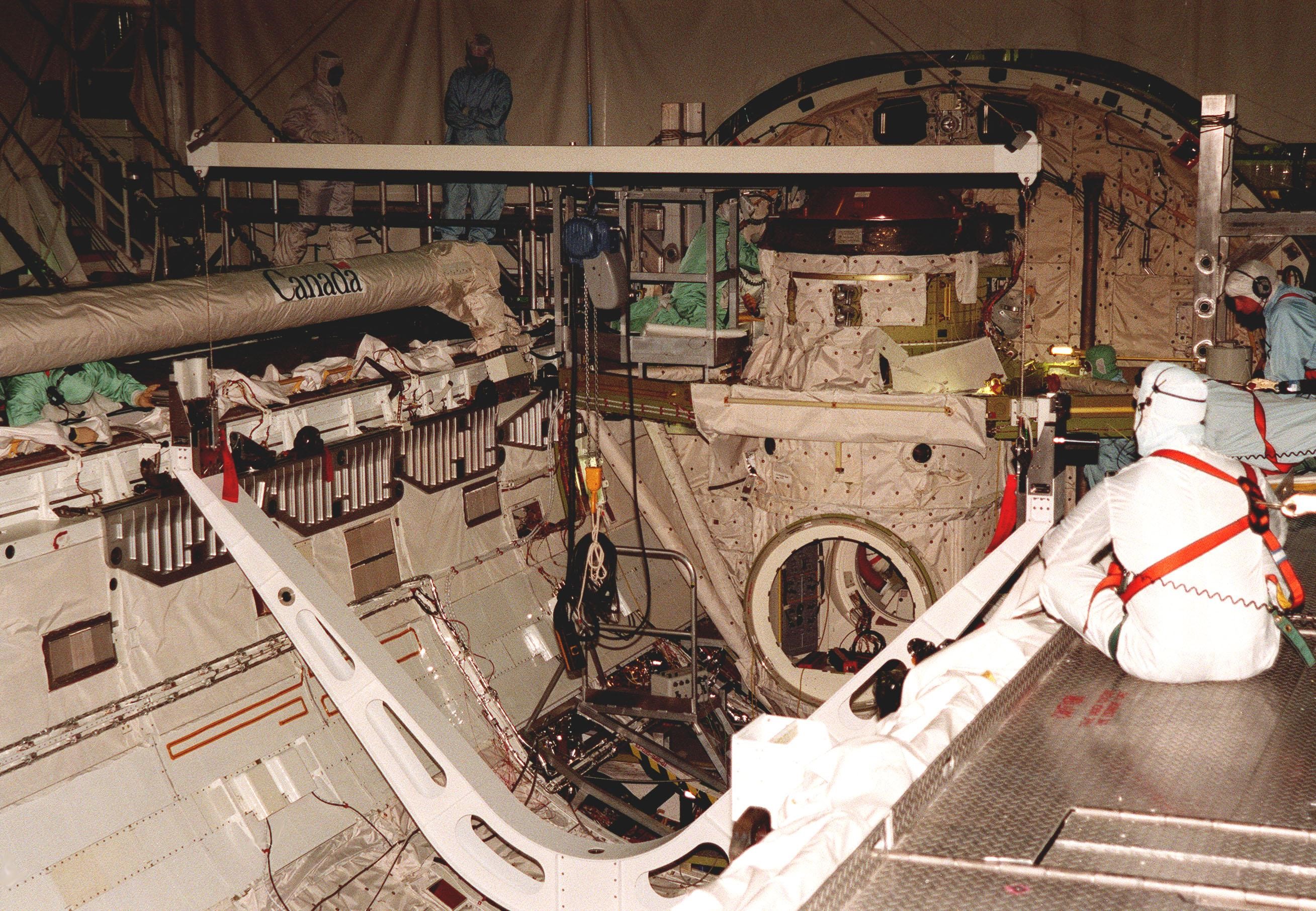 KENNEDY SPACE CENTER, FLA. -- Workers in the Orbiter Processing Facility (OPF) Bay 1 check the Keel Yoke Device (KYD) installed in the orbiter Discovery. The KYD will support the International Cargo Carrier (ICC) to be fitted in the orbiter for mission STS-96. The ICC will carry unpressurized cargo such as the external Russian cargo crane known as STRELA, the SPACEHAB Oceaneering Space System Box (SHOSS), which is a logistics items carrier, and an ORU Transfer Device (OTD), a U.S.-built crane that will be stowed on the station for use during future ISS assembly missions. The primary payload of STS-96 is the SPACEHAB Double Module, an element of the International Space Station. STS-96 is targeted for launch on May 20 at 9:32 a.m. from Launch Pad 39B