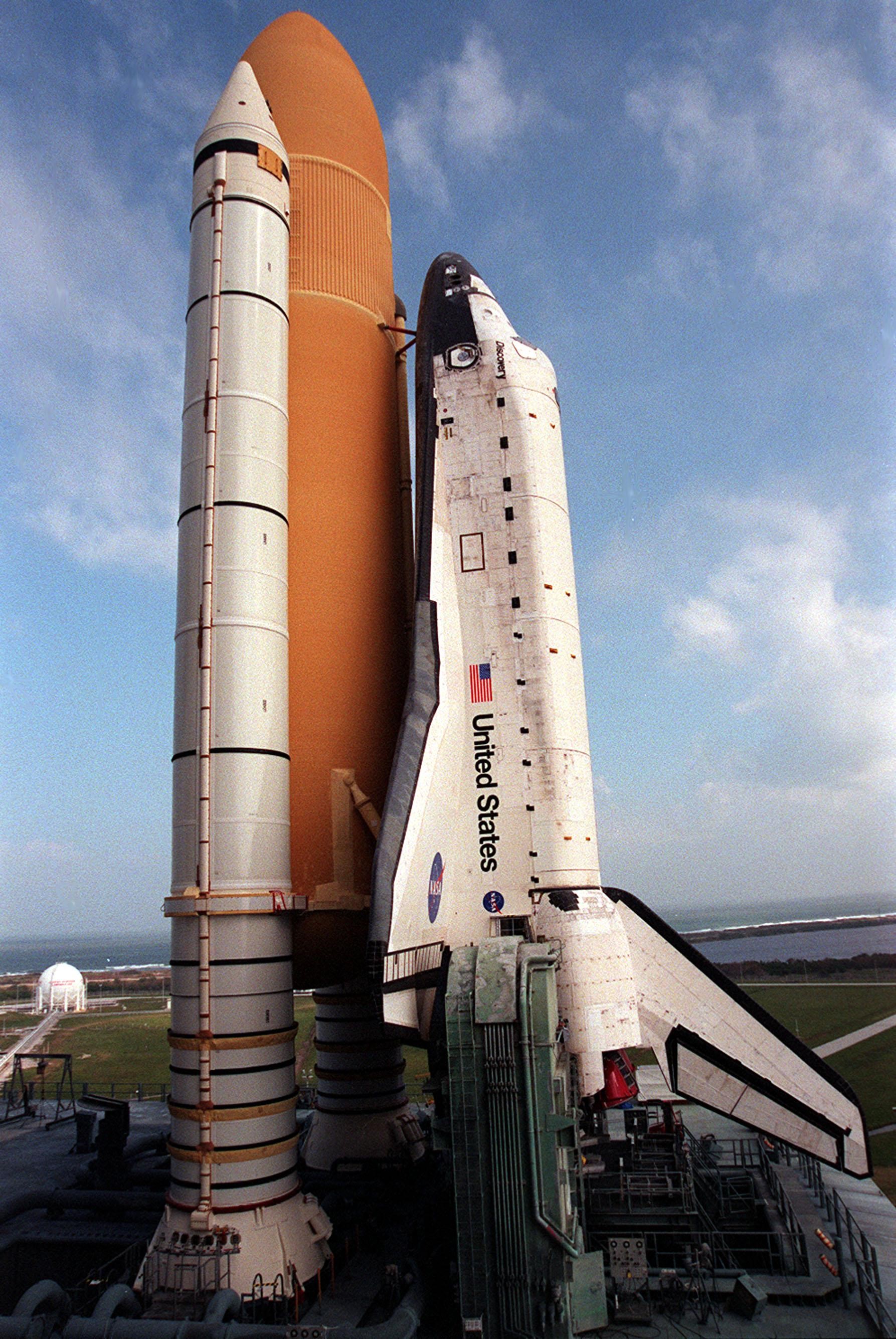 KENNEDY SPACE CENTER, Fla. -- At Launch Pad 39B, Space Shuttle Discovery towers against the hazy blue sky after a seven-hour trek from the Vehicle Assembly Building. The orbiter, external tank and solid rocket boosters will undergo final preparations for the STS-103 launch. The mission is a "call-up" due to the need to replace and repair portions of the Hubble Space Telescope. Although Hubble is operating normally and conducting its scientific observations, only three of its six gyroscopes are working properly. Four EVA's are planned to make the necessary repairs and replacements on the telescope. The STS-103 crew members are Commander Curtis L. Brown Jr., Pilot Scott J. Kelly, Steven L. Smith, C. Michael Foale (Ph.D.), John M. Grunsfeld (Ph.D.), and Claude Nicollier of Switzerland and Jean-François Clervoy of France, both with the European Space Agency. The mission is targeted for launch Dec. 6 at 2:37 a.m. EST