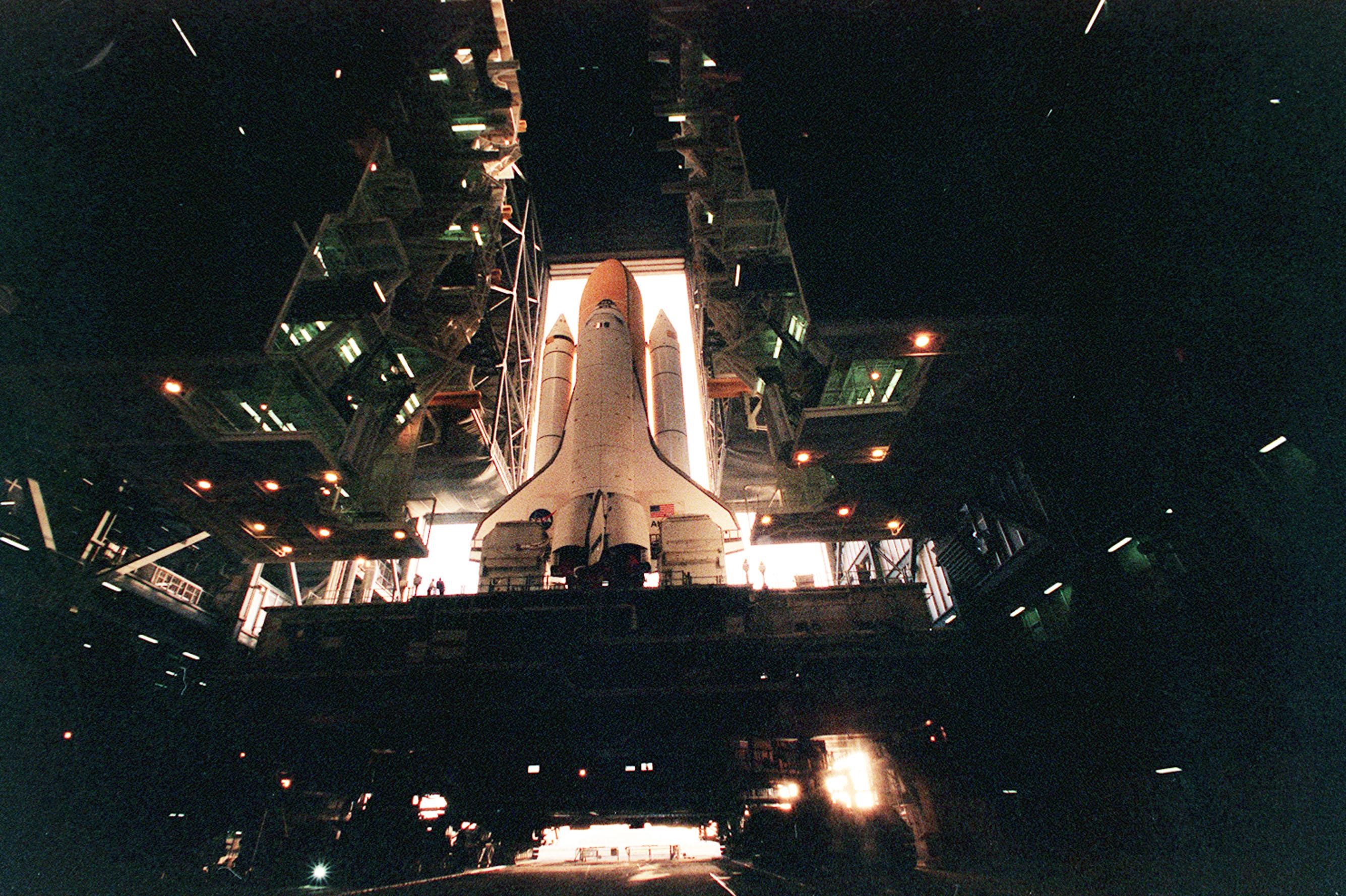 A wide-angle view of the Space Shuttle Atlantis as it stands ready inside the Vehicle Assembly Building for rollout to Launch Pad 39A. It sits on top of a Mobile Launcher Platform (MLP), a two-story steel structure 25 feet high, which supports and restrains the Shuttle during assembly, transit and while at the pad. The MLP weighs 8.23 million pounds. The entire configuration of Shuttle plus MLP is moved to the pad aboard a crawler-transporter. Liftoff of Atlantis on mission STS-101 is scheduled for April 17 at 7:03 p.m. EDT. STS-101 is a logistics and resupply mission for the International Space Station, to restore full redundancy to the International Space Station power system in preparation for the arrival of the next pressurized module, the Russian-built Zvezda