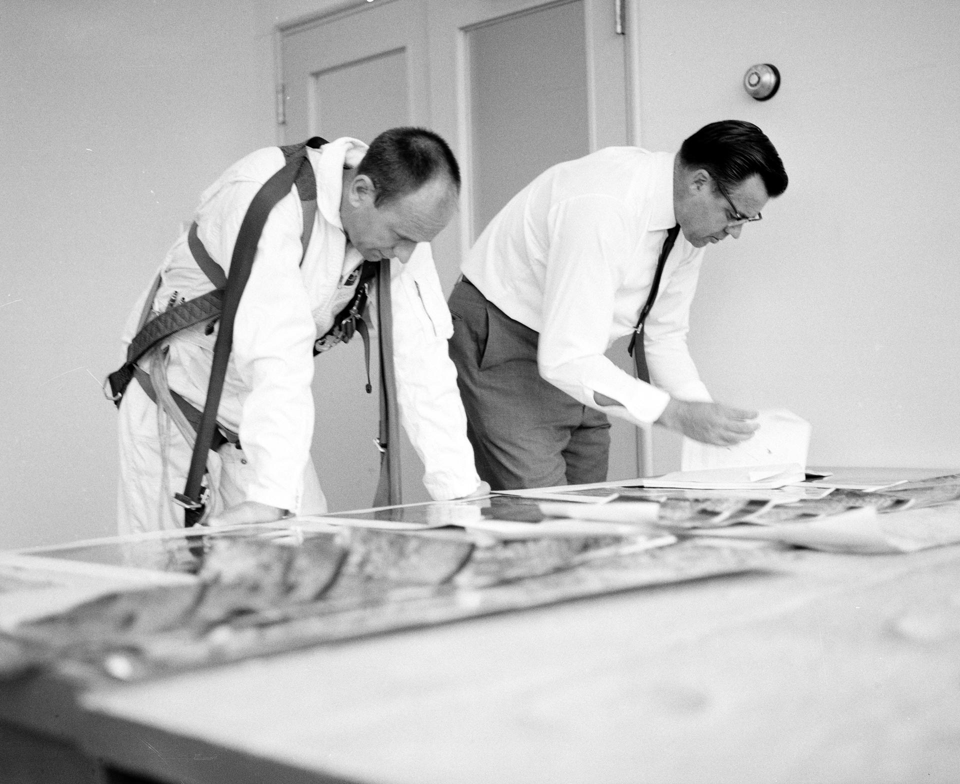 Astronauts Conrad and Bean at Lunar Landing Research Facility. Alan Bean was one of the third group of astronauts named by NASA in October 1963. He served as backup astronaut for the Gemini 10 and Apollo 9 missions. In September of 1962, Mr. Conrad was selected as an astronaut by NASA. His first flight was Gemini V, which established the space endurance record and placed the United States in the lead for man-hours in space. As commander of Gemini XI, Mr. Conrad helped to set a world's altitude record. He then served as commander of Apollo XII, the second lunar landing. On Mr. Conrad's final mission, he served as commander of Skylab II, the first United States Space Station. https://www.nasa.gov/astronauts/biographies/former for more information.