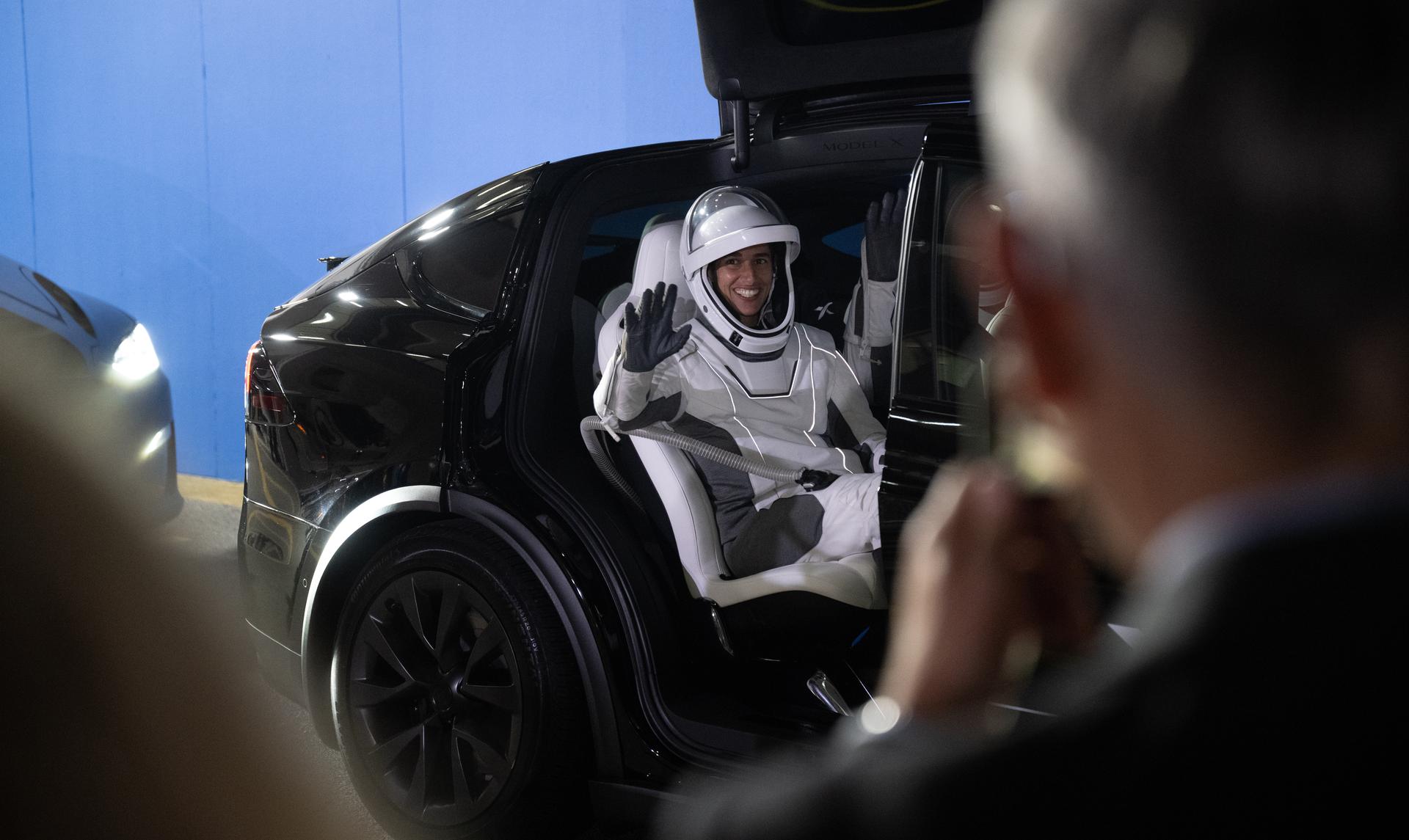 NASA astronaut Jasmin Moghbeli waves to NASA leadership as she and fellow crewmates Roscosmos cosmonaut Konstantin Borisov, ESA (European Space Agency) astronaut Andreas Mogensen, and Japan Aerospace Exploration Agency (JAXA) astronaut Satoshi Furukawa prepare to depart the Neil A. Armstrong Operations and Checkout Building for Launch Complex 39A to board the SpaceX Dragon spacecraft for the Crew-7 mission launch, Saturday, Aug. 26, 2023, at NASA’s Kennedy Space Center in Florida. NASA’s SpaceX Crew-7 mission is the seventh crew rotation mission of the SpaceX Crew Dragon spacecraft and Falcon 9 rocket to the International Space Station as part of the agency’s Commercial Crew Program. Moghbeli, Mogensen, Furukawa, and Borisov are scheduled to launch at 3:27 a.m. EDT, from Launch Complex 39A at the Kennedy Space Center. Photo Credit: (NASA/Joel Kowsky)