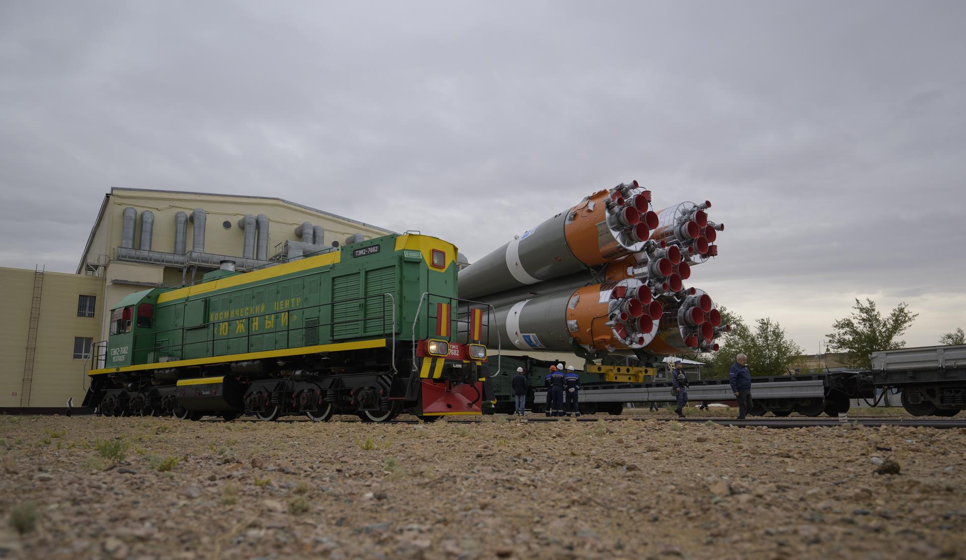 The Soyuz rocket is rolled out by train to the launch pad at Site 31, Sunday, Sept. 8, 2024, at the Baikonur Cosmodrome in Kazakhstan. Expedition 72 crew members: NASA astronaut Don Pettit, Roscosmos cosmonauts Alexey Ovchinin, and Ivan Vagner, are scheduled to launch aboard their Soyuz MS-26 spacecraft on September 11. Photo Credit: (NASA/Bill Ingalls)