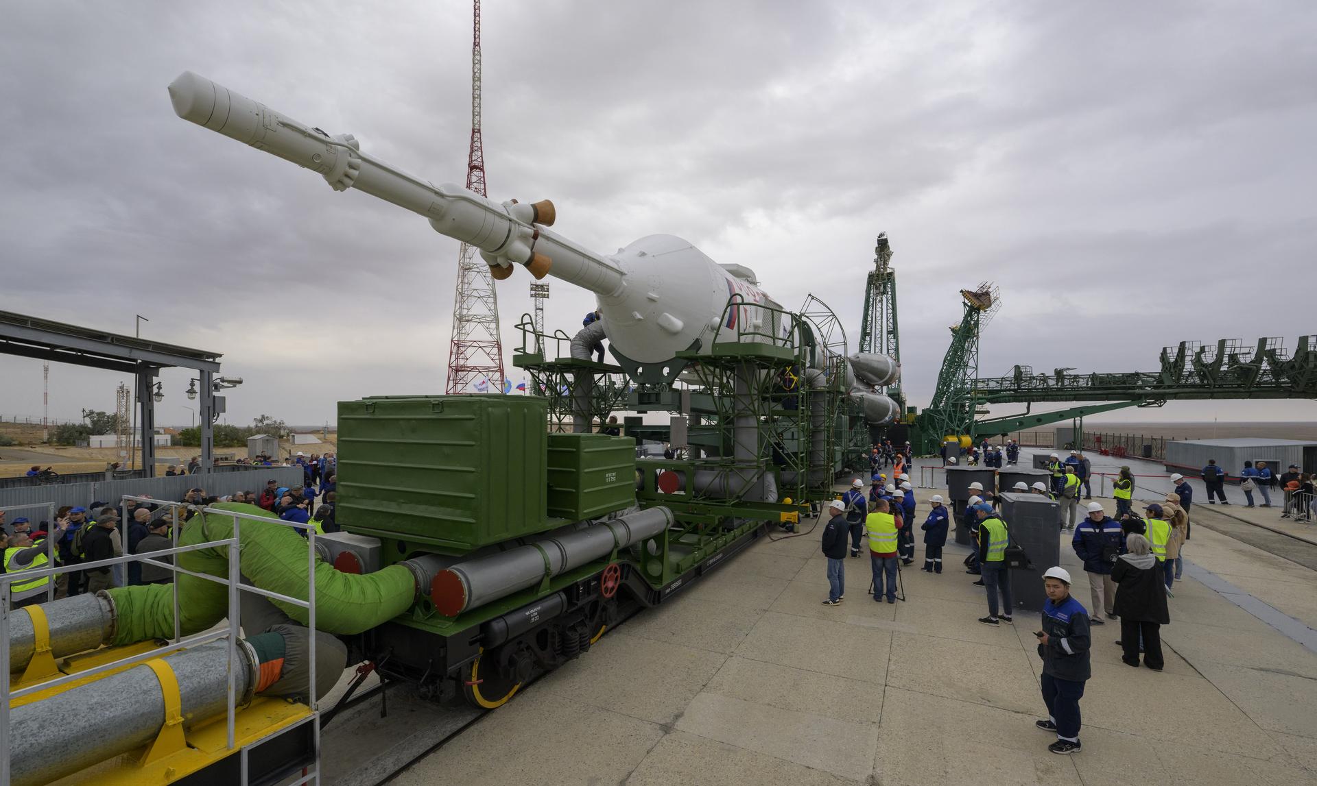 The Soyuz rocket is rolled out by train to the launch pad at Site 31, Sunday, Sept. 8, 2024, at the Baikonur Cosmodrome in Kazakhstan. Expedition 72 crew members: NASA astronaut Don Pettit, Roscosmos cosmonauts Alexey Ovchinin, and Ivan Vagner, are scheduled to launch aboard their Soyuz MS-26 spacecraft on September 11. Photo Credit: (NASA/Bill Ingalls)