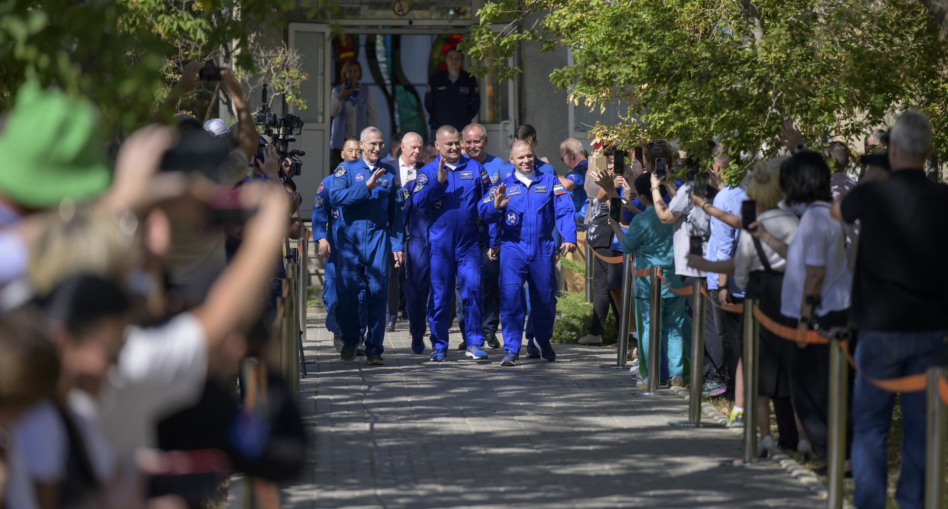 Expedition 72 crew members: NASA astronaut Don Pettit, left, Roscosmos cosmonauts Alexey Ovchinin, and Ivan Vagner, right, wave as they depart the Cosmonaut Hotel to suit-up for their Soyuz launch to the International Space Station, Wednesday, Sept. 11, 2024, in Baikonur, Kazakhstan. The launch will send Pettit, Ovchinin, and Vagner on a mission to the International Space Station. Photo Credit: (NASA/Bill Ingalls)