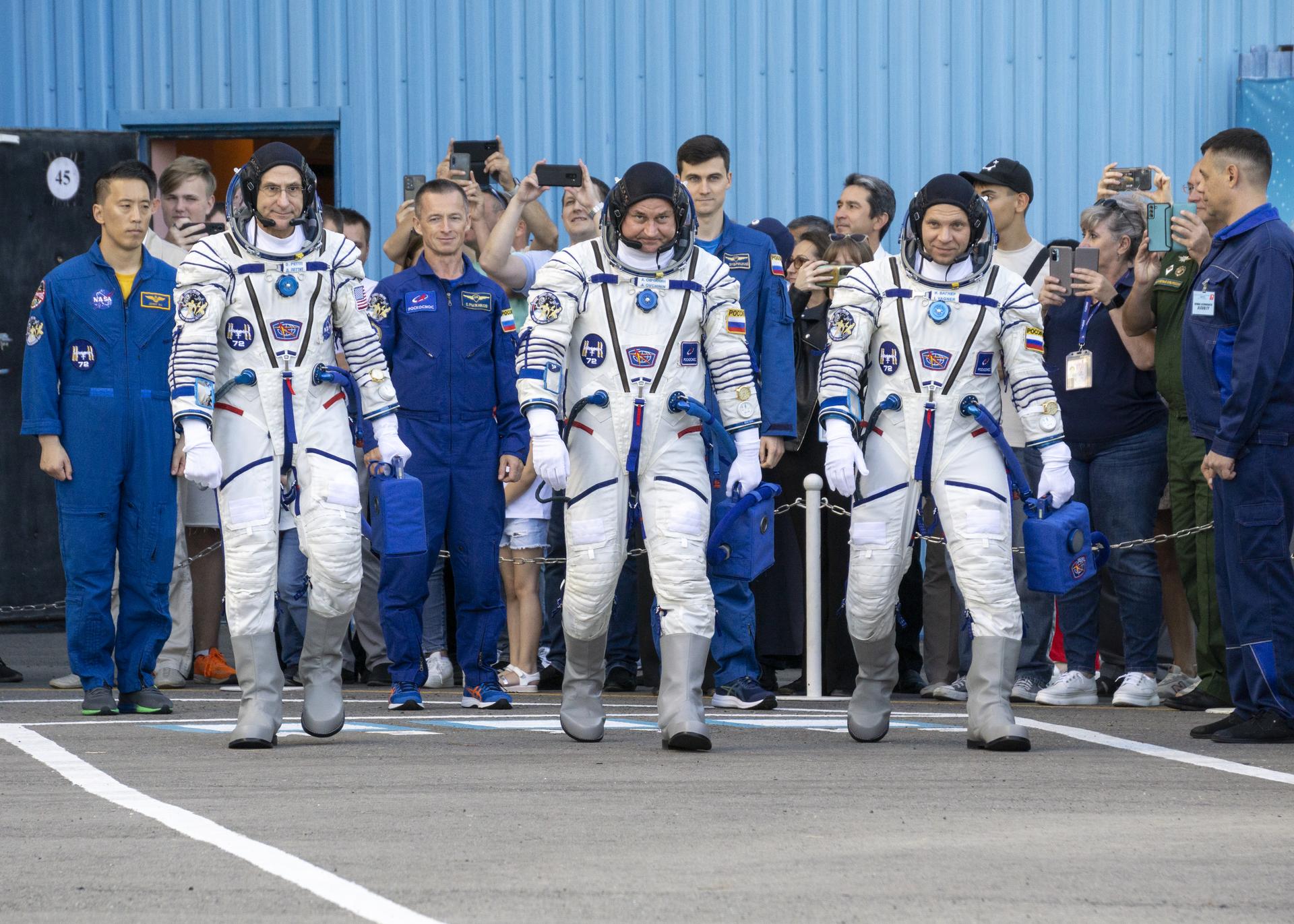 Expedition 72 crew members: NASA astronaut Don Pettit, left, Roscosmos cosmonauts Alexey Ovchinin, and Ivan Vagner,right, depart building 254 for their Soyuz launch to the International Space Station Wednesday, Sept. 11, 2024 in Baikonur, Kazakhstan. The launch will send Pettit, Ovchinin, and Vagner on a mission to the International Space Station. Photo Credit: (NASA/Victor Zelentsov)