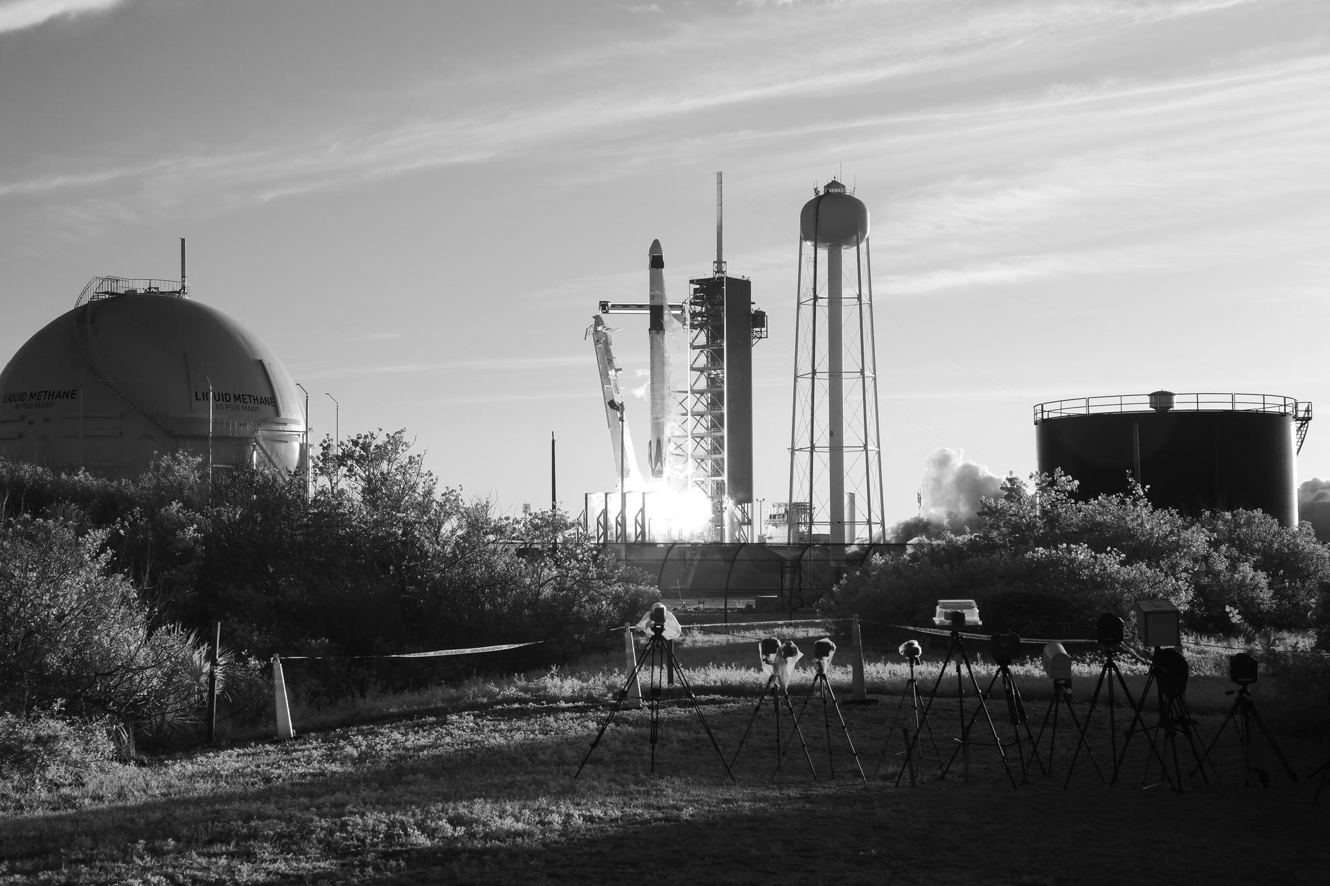 In this black and white infrared image, a SpaceX Falcon 9 rocket carrying the company's Dragon spacecraft is launched on NASA’s SpaceX Crew-10 mission to the International Space Station with NASA astronauts Anne McClain and Nichole Ayers, JAXA (Japan Aerospace Exploration Agency) astronaut Takuya Onishi, and Roscosmos cosmonaut Kirill Peskov onboard, Tuesday, March 11, 2025, from NASA's Kennedy Space Center in Florida. NASA’s SpaceX Crew-10 mission is the tenth crew rotation mission of the SpaceX Dragon spacecraft and Falcon 9 rocket to the International Space Station as part of the agency’s Commercial Crew Program. McClain, Ayers, Onishi, and Peskov launched at 7:03 p.m. EDT from Launch Complex 39A at the NASA's Kennedy Space Center to begin a six month mission aboard the orbital outpost. Photo Credit: (NASA/Aubrey Gemignani)