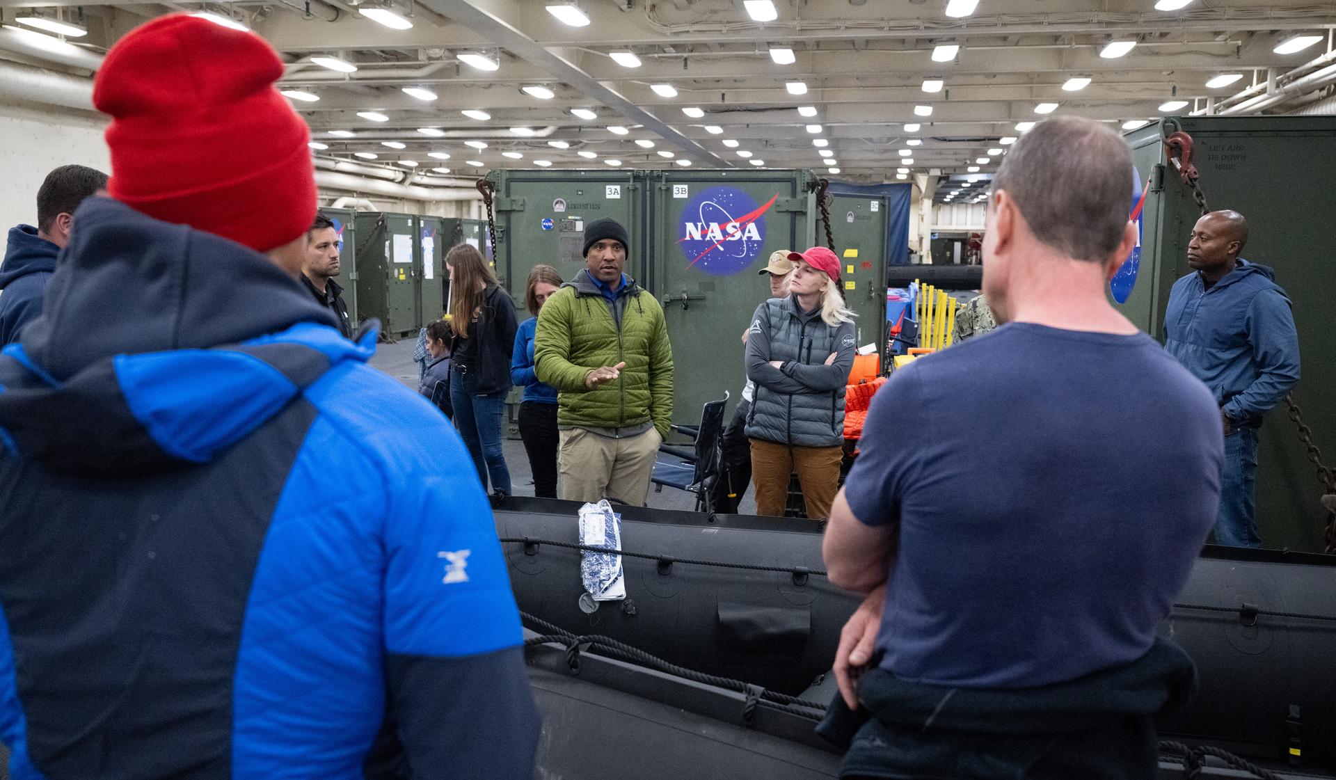Artemis II NASA astronaut Victor Glover, second from left, talks with NASA astronauts Deniz Burnham, center, Stan Love, second from left, Artemis II backup crew member Andre Douglas, and ESA (European Space Agency) astronaut Luca Parmitano, left, during a familiarization walkthrough onboard USS Somerset during Underway Recovery Test 12, Tuesday, March 25, 2025. During the test, NASA and Department of Defense teams are practicing to ensure recovery procedures are validated as NASA plans to send the Artemis II astronauts around the Moon and splashdown in the Pacific Ocean. Photo Credit: (NASA/Joel Kowsky)