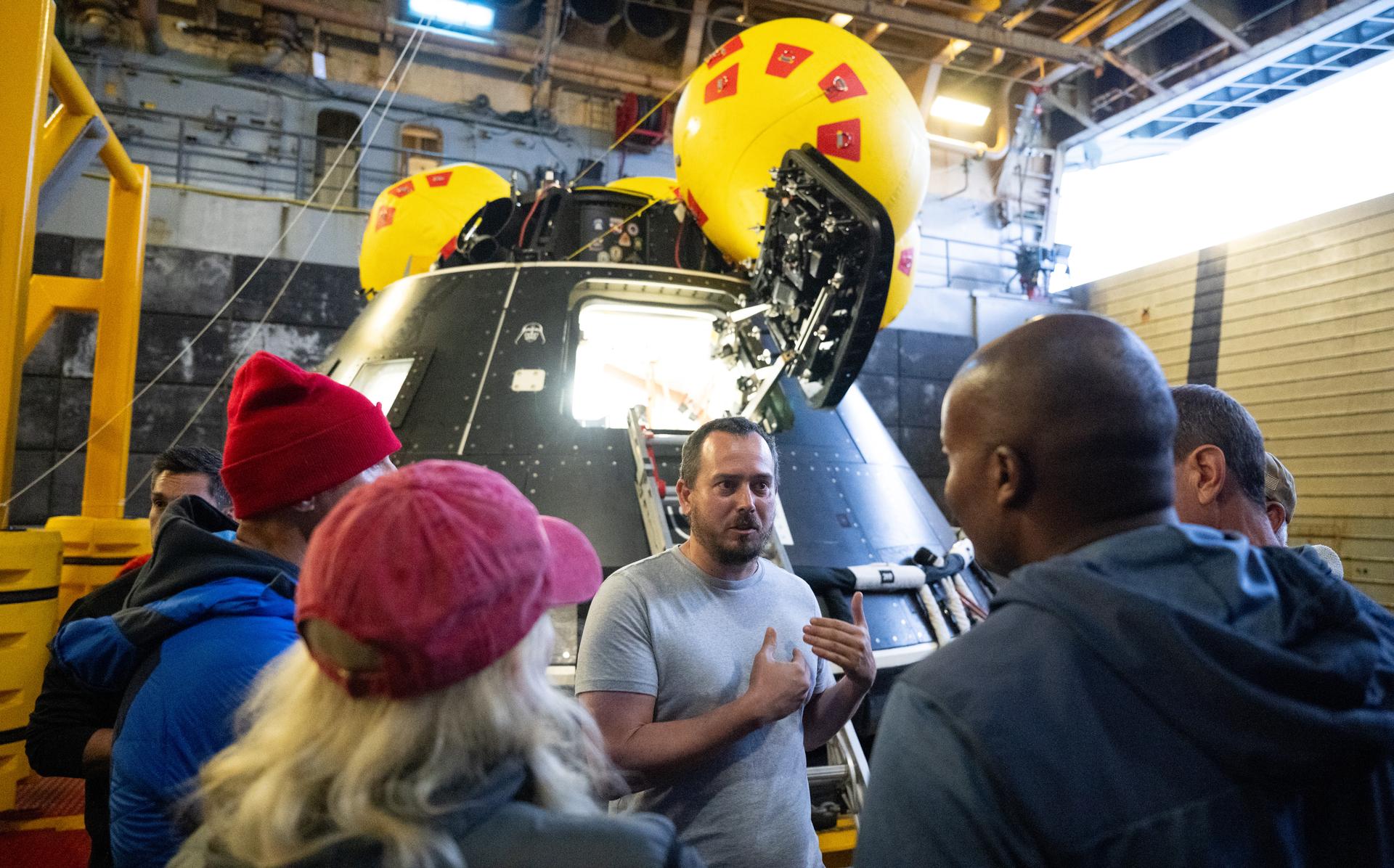 Bert Kallio, lead mechanical engineer for the Crew Module Test Article (CMTA), speaks with NASA astronauts Stan Love, Andre Douglas, Deniz Burnham, and ESA (European Space Agency) astronaut Luca Parmitano during a familiarization walkthrough as part of Underway Recovery Test-12 onboard USS Somerset, Tuesday, March 25, 2025. During the test, NASA and Department of Defense teams are practicing to ensure recovery procedures are validated as NASA plans to send the Artemis II astronauts around the Moon and splashdown in the Pacific Ocean. Photo Credit: (NASA/Joel Kowsky)