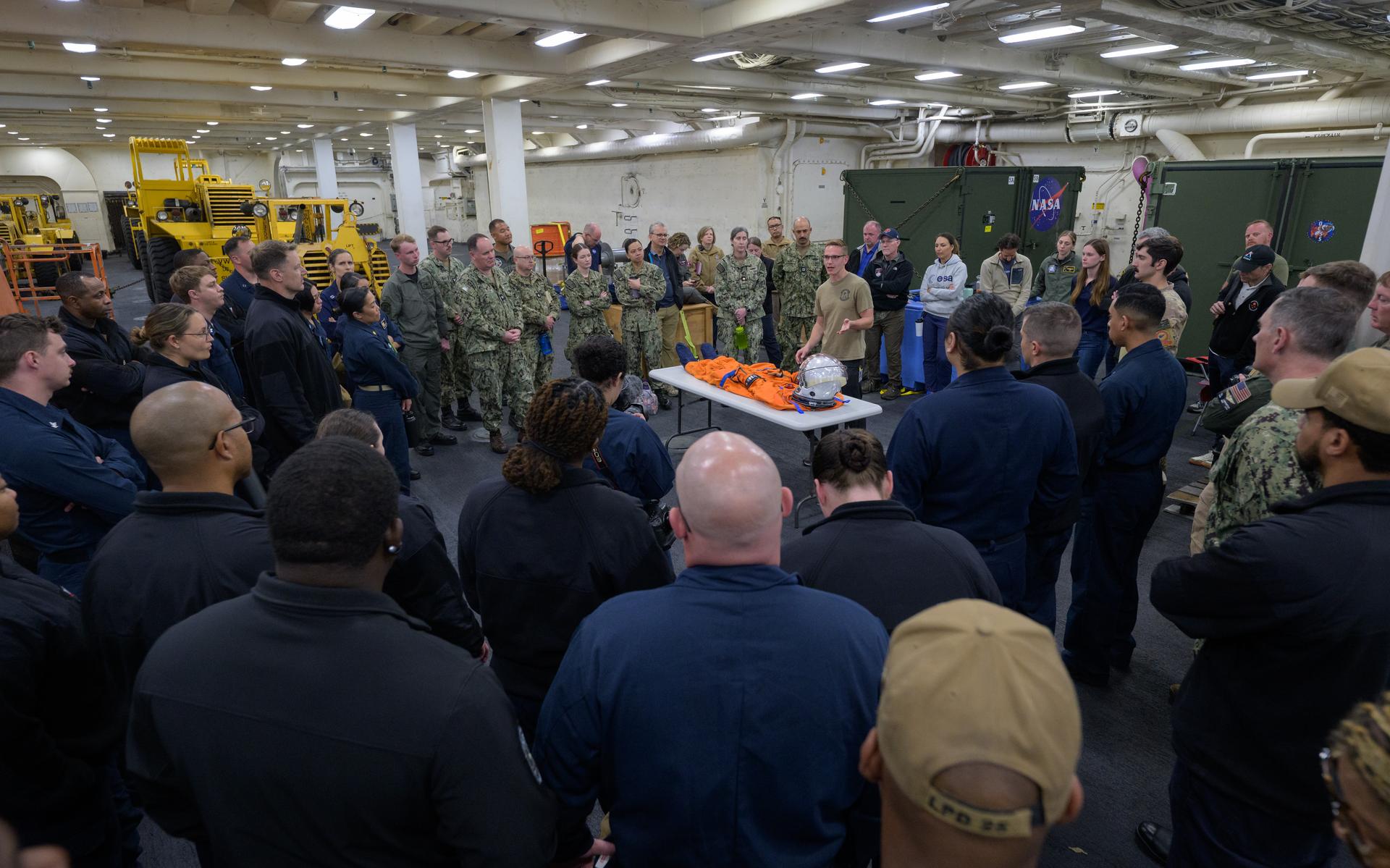 NASA and Department of Defense teams familiarize themselves with the pressure suits the Artemis II crew will be wearing when they return from their mission during Underway Recovery Test-12 onboard USS Somerset off the coast of California, Wednesday, March 26, 2025. During the test, NASA and Department of Defense teams are practicing to ensure recovery procedures are validated as NASA plans to send Artemis II astronauts around the Moon and splashdown in the Pacific Ocean. Photo Credit: (NASA/Joel Kowsky)