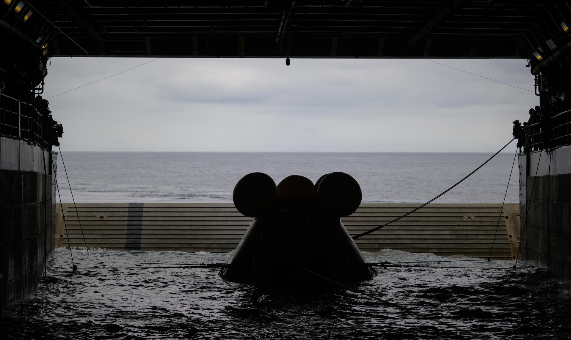 The Crew Module Test Article (CMTA), a full scale mockup of the Orion spacecraft, sits nestled in its cradle during Underway Recovery Test-12 onboard USS Somerset off the coast of California, Wednesday, March 26, 2025. During the test, NASA and Department of Defense teams are practicing to ensure recovery procedures are validated as NASA plans to send Artemis II astronauts around the Moon and splashdown in the Pacific Ocean. Photo Credit: (NASA/Joel Kowsky)