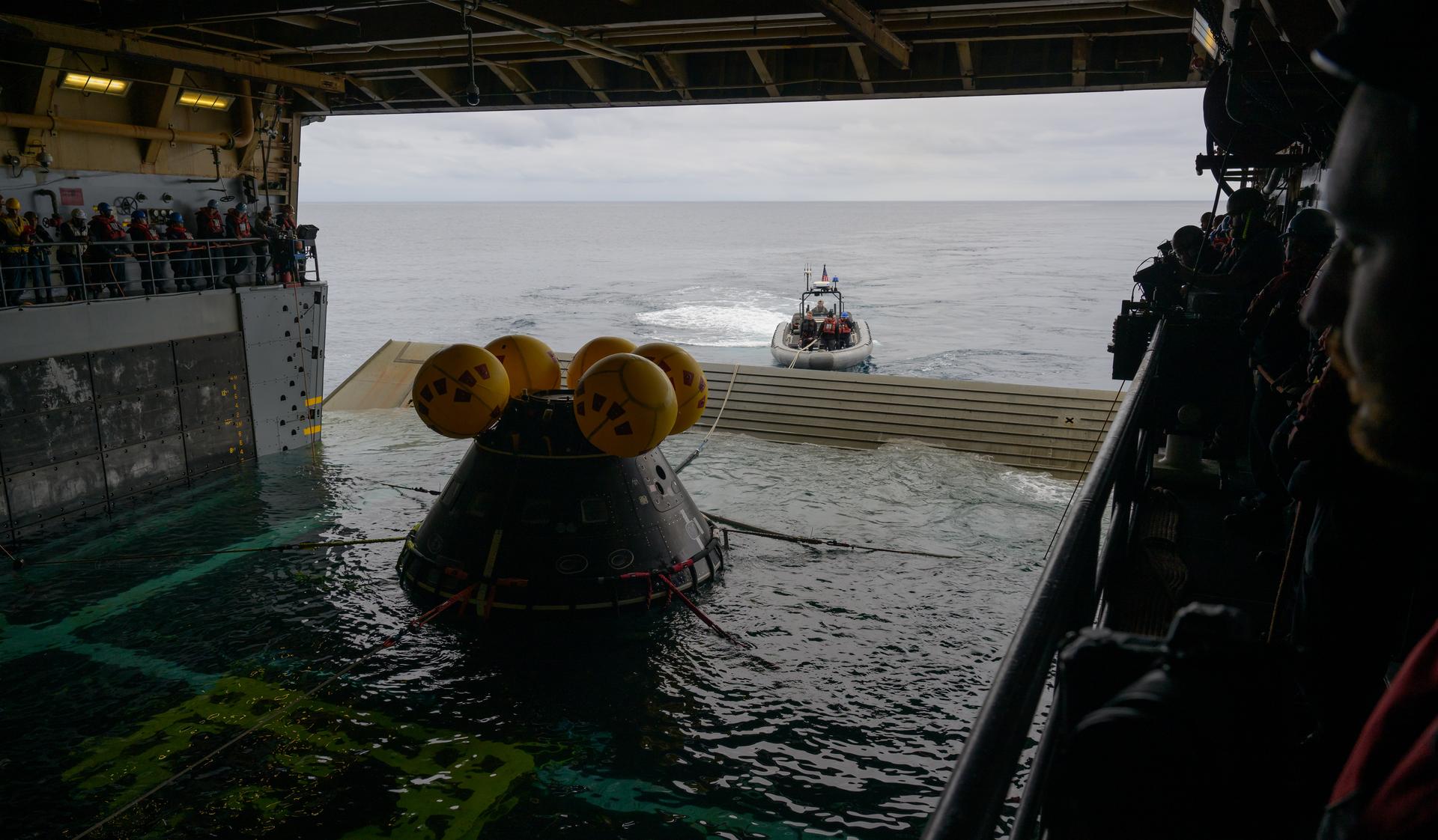 The Crew Module Test Article (CMTA), a full scale mockup of the Orion spacecraft, is seen during Underway Recovery Test-12 onboard USS Somerset off the coast of California, Wednesday, March 26, 2025. During the test, NASA and Department of Defense teams are practicing to ensure recovery procedures are validated as NASA plans to send Artemis II astronauts around the Moon and splashdown in the Pacific Ocean. Photo Credit: (NASA/Bill Ingalls)
