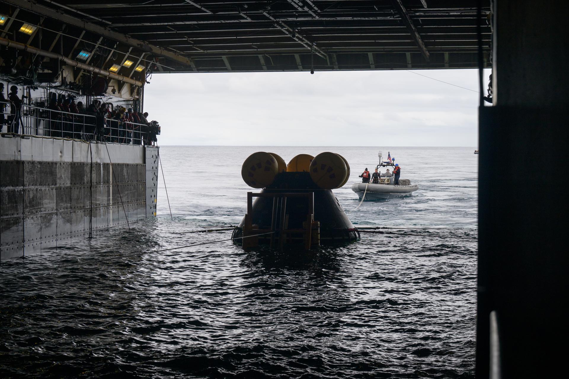 The Crew Module Test Article (CMTA), a full scale mockup of the Orion spacecraft, is seen during Underway Recovery Test-12 onboard USS Somerset off the coast of California, Wednesday, March 26, 2025. During the test, NASA and Department of Defense teams are practicing to ensure recovery procedures are validated as NASA plans to send Artemis II astronauts around the Moon and splashdown in the Pacific Ocean. Photo Credit: (NASA/Bill Ingalls)
