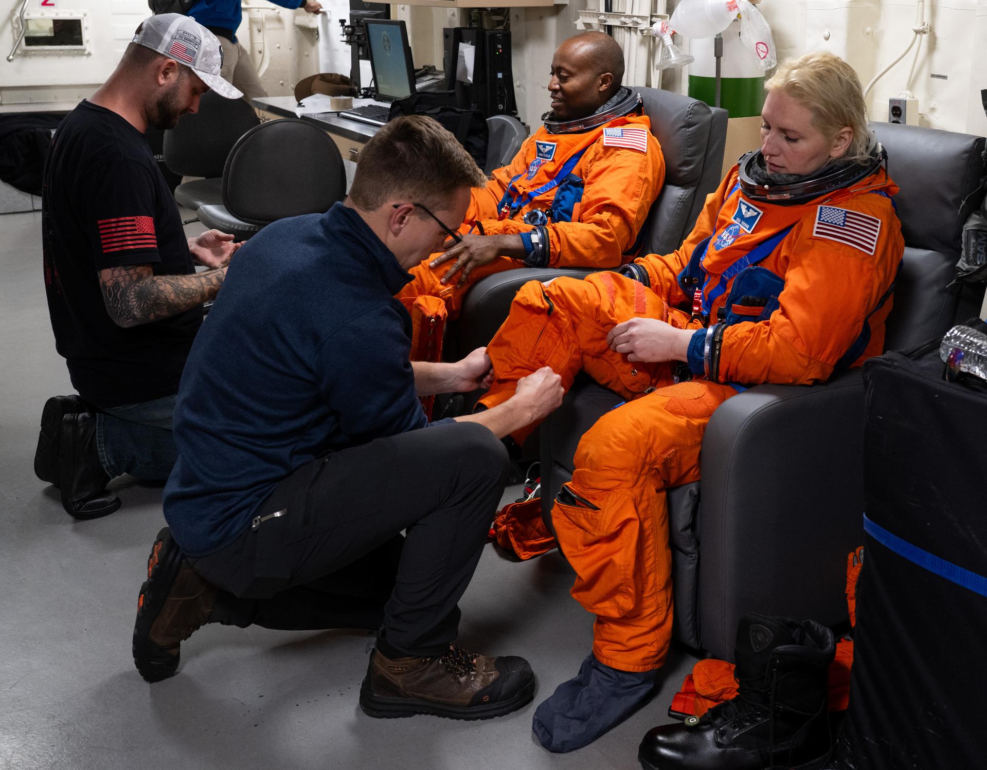 NASA astronauts Andre Douglas, left, and Deniz Burnham, are seen as they are assisted with putting on their Orion Crew Survival System suits as they prepare to take part in practicing Artemis recovery procedures during Underway Recovery Test-12 onboard USS Somerset, Thursday, March 27, 2025. During the test, NASA and Department of Defense teams are practicing to ensure recovery procedures are validated as NASA plans to send the Artemis II astronauts around the Moon and splashdown in the Pacific Ocean. Photo Credit: (NASA/Joel Kowsky)