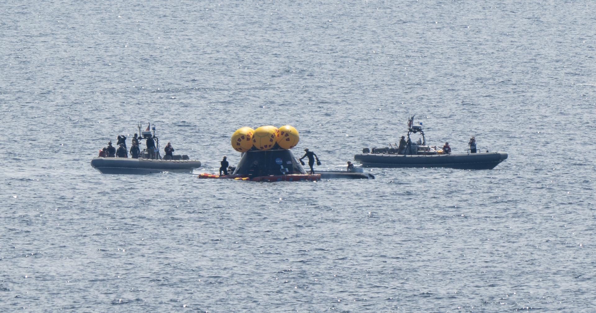 Teams work around the Crew Module Test Article (CMTA) as they practice Artemis recovery operations during Underway Recovery Test-12 onboard USS Somerset off the coast of California, Thursday, March 27, 2025. During the test, NASA and Department of Defense teams are practicing to ensure recovery procedures are validated as NASA plans to send the Artemis II astronauts around the Moon and splashdown in the Pacific Ocean. Photo Credit: (NASA/Joel Kowsky)