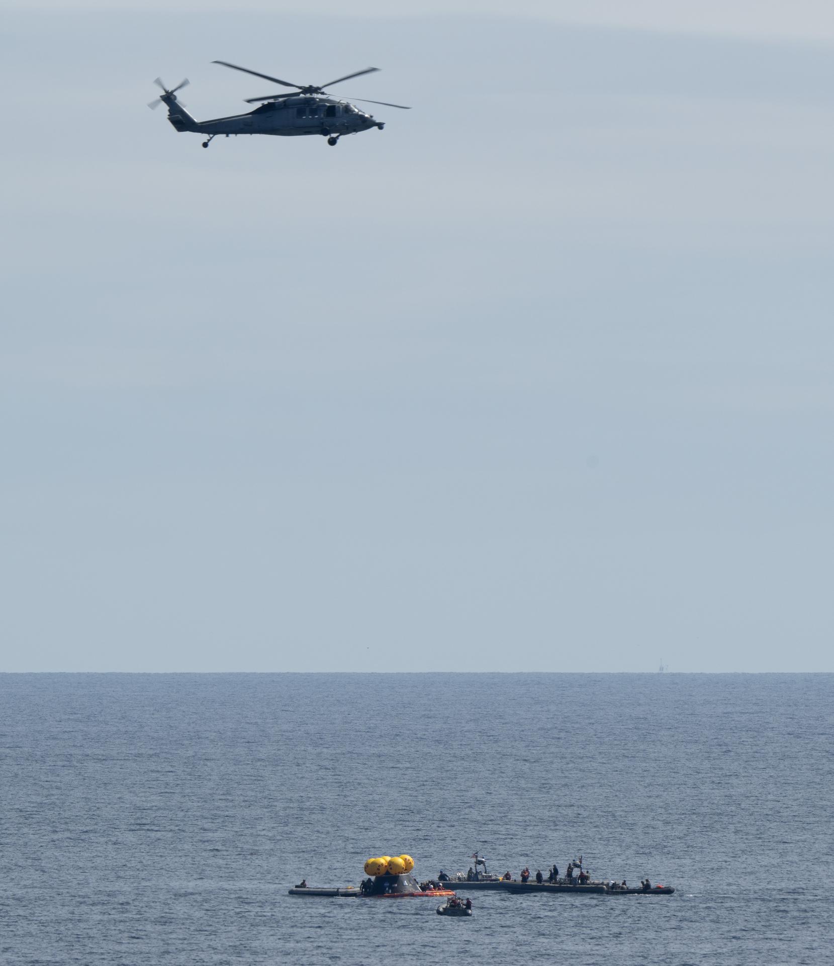 A Navy MH-60 Seahawk helicopter from Helicopter Sea Combat Squadron (HSC) 23 flies over the Crew Module Test Article (CMTA) as teams practice operations during Underway Recovery Test-12 onboard USS Somerset, Thursday, March 27, 2025. During the test, NASA and Department of Defense teams are practicing to ensure recovery procedures are validated as NASA plans to send the Artemis II astronauts around the Moon and splashdown in the Pacific Ocean. Photo Credit: (NASA/Joel Kowsky)
