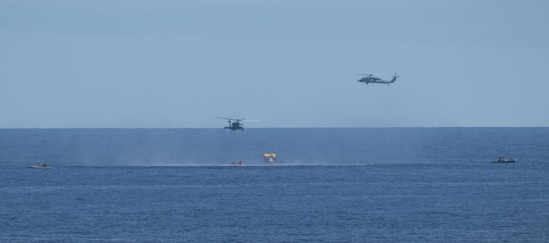 Two Navy MH-60 Seahawks from Helicopter Sea Combat Squadron (HSC) 23 are seen as they approach the Crew Module Test Article (CMTA) to recover crew members as NASA and Navy recovery teams practice operations during Underway Recovery Test-12 onboard USS Somerset, Thursday, March 27, 2025. During the test, NASA and Department of Defense teams are practicing to ensure recovery procedures are validated as NASA plans to send the Artemis II astronauts around the Moon and splashdown in the Pacific Ocean. Photo Credit: (NASA/Joel Kowsky)