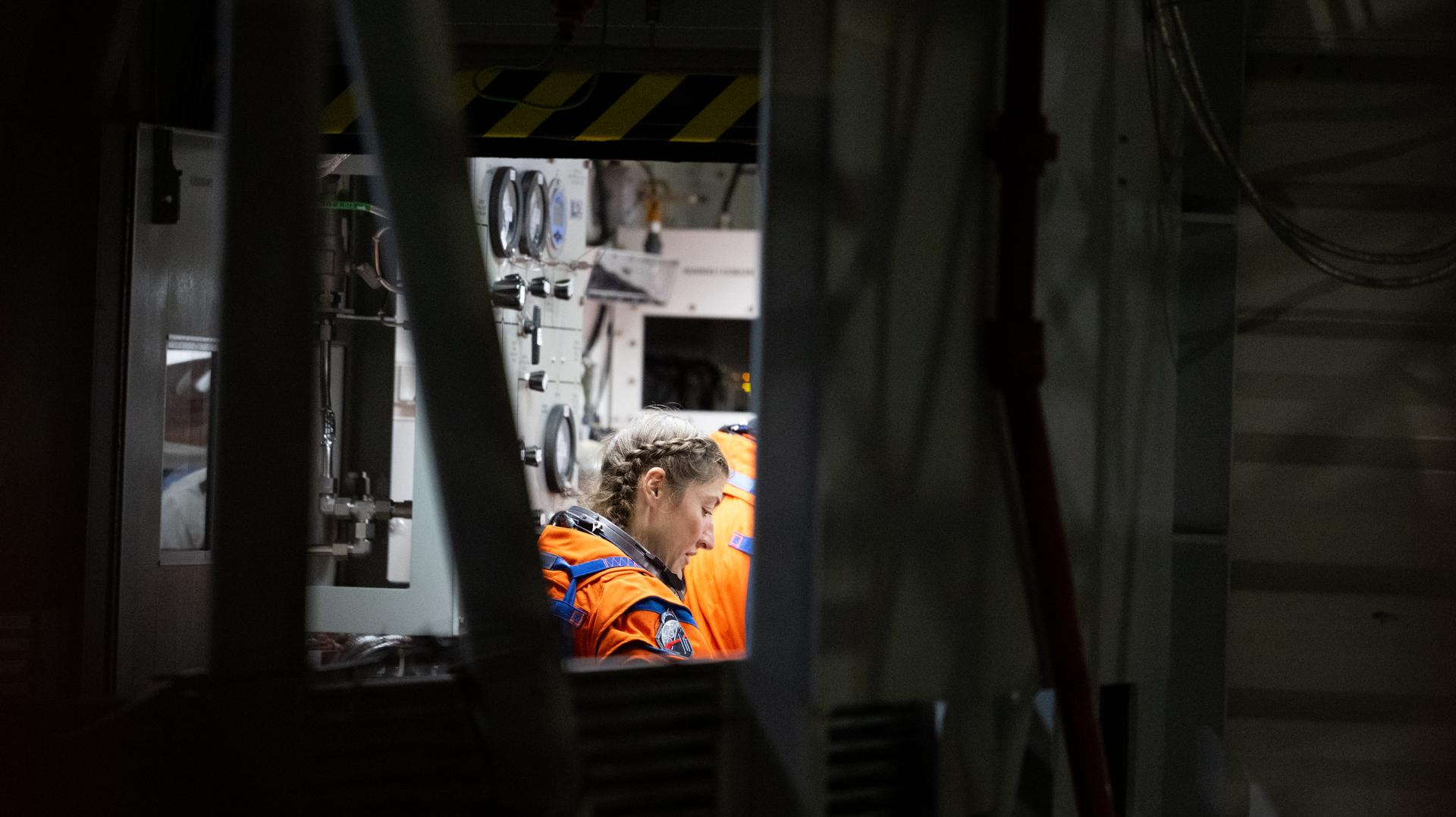 Artemis II crewmember NASA astronaut Christina Koch, mission specialist, is seen inside the white room at the 275-foot level of the mobile launcher she and fellow crewmates NASA astronauts Reid Wiseman, commander; Victor Glover, pilot; and CSA (Canadian Space Agency) astronaut Jeremy Hansen, mission specialist, prepare to board their Orion spacecraft atop NASA’s Space Launch System rocket during the Artemis II countdown demonstration test, Saturday, Dec. 20, 2025, inside the Vehicle Assembly Building at NASA’s Kennedy Space Center in Florida. For this operation, the Artemis II crew and launch teams are simulating the launch day timeline including suit-up, walkout, and spacecraft ingress and egress. Through the Artemis campaign, NASA will send astronauts to explore the Moon for scientific discovery, economic benefits, and to build the foundation for the first crewed missions to Mars, for the benefit of all. Photo Credit: (NASA/Joel Kowsky)