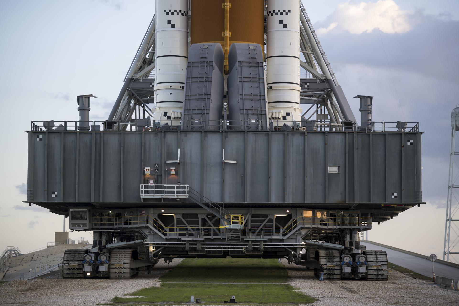 NASA’s Space Launch System (SLS) rocket and Orion spacecraft, secured to the mobile launcher, are seen as they arrive at Launch Pad 39B, Friday, March 20, 2026, at NASA’s Kennedy Space Center in Florida. NASA’s Artemis II test flight will take Commander Reid Wiseman, Pilot Victor Glover, and Mission Specialist Christina Koch from NASA, and Mission Specialist Jeremy Hansen from the CSA (Canadian Space Agency), around the Moon and back to Earth with launch opportunities beginning in April 2026. Photo Credit: (NASA/Aubrey Gemignani)